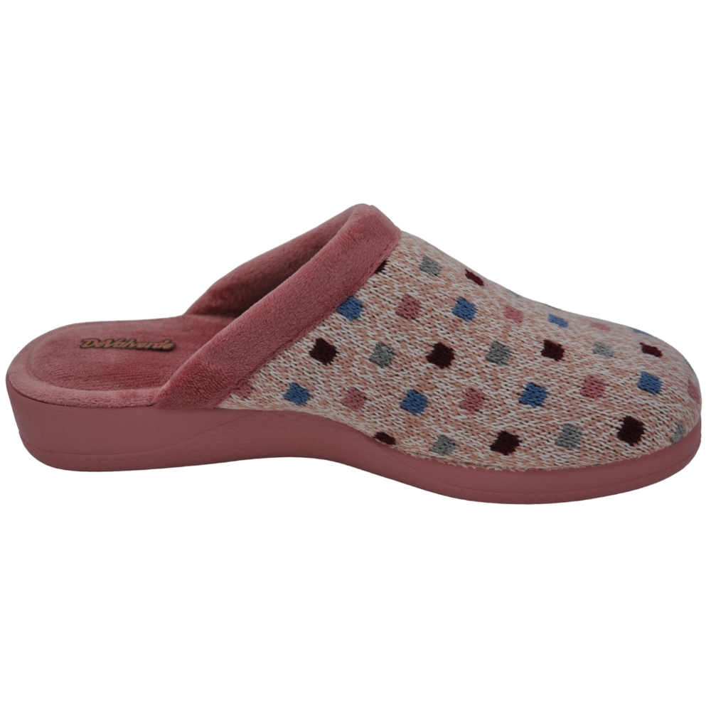 DeValverde 1159. Zapatillas para el hogar destalonadas, elaboradas en fieltro textil, con estampado de "cuadrados" en cada zapatilla y suela de goma antideslizante. Hechas en España.