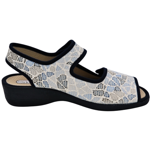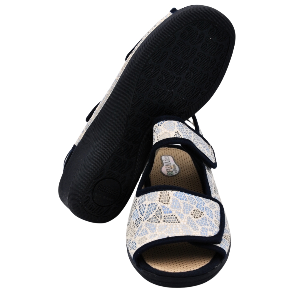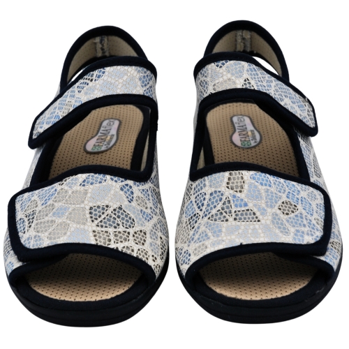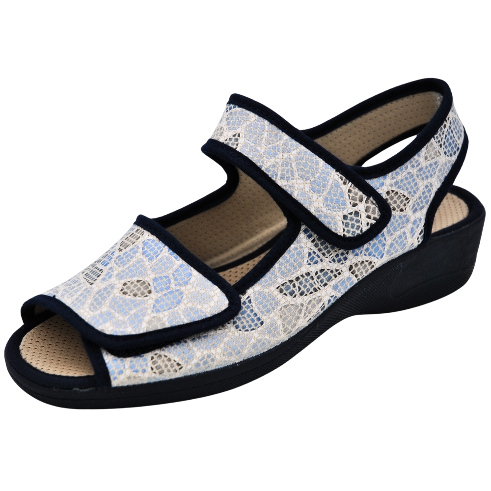 Pantuflas de casa con talón abierto y dedos fuera con cuña de 4.5cm, de la marca DeValverde 2796 color marino, tiene dos cierres adhesivos, uno el tobillo y otro en el empeine ideal para pies anchos. Forro interior en textil y suela caucho natural (latex). Chinela Ideal para mantener tus pies frescos en verano. Zapatilla de casa para mujer, piso con grabado especial rugoso para evitar posibles deslizamientos. Babucha fabricada con tejidos en microfibras y algodón que permiten una constante ventilación. Relleno de corcho natural para una total absorción de los posibles impactos. Respetuosos con la naturaleza. Utilizando materiales que cuidan al máximo posible el medio ambiente. Hecho en España.