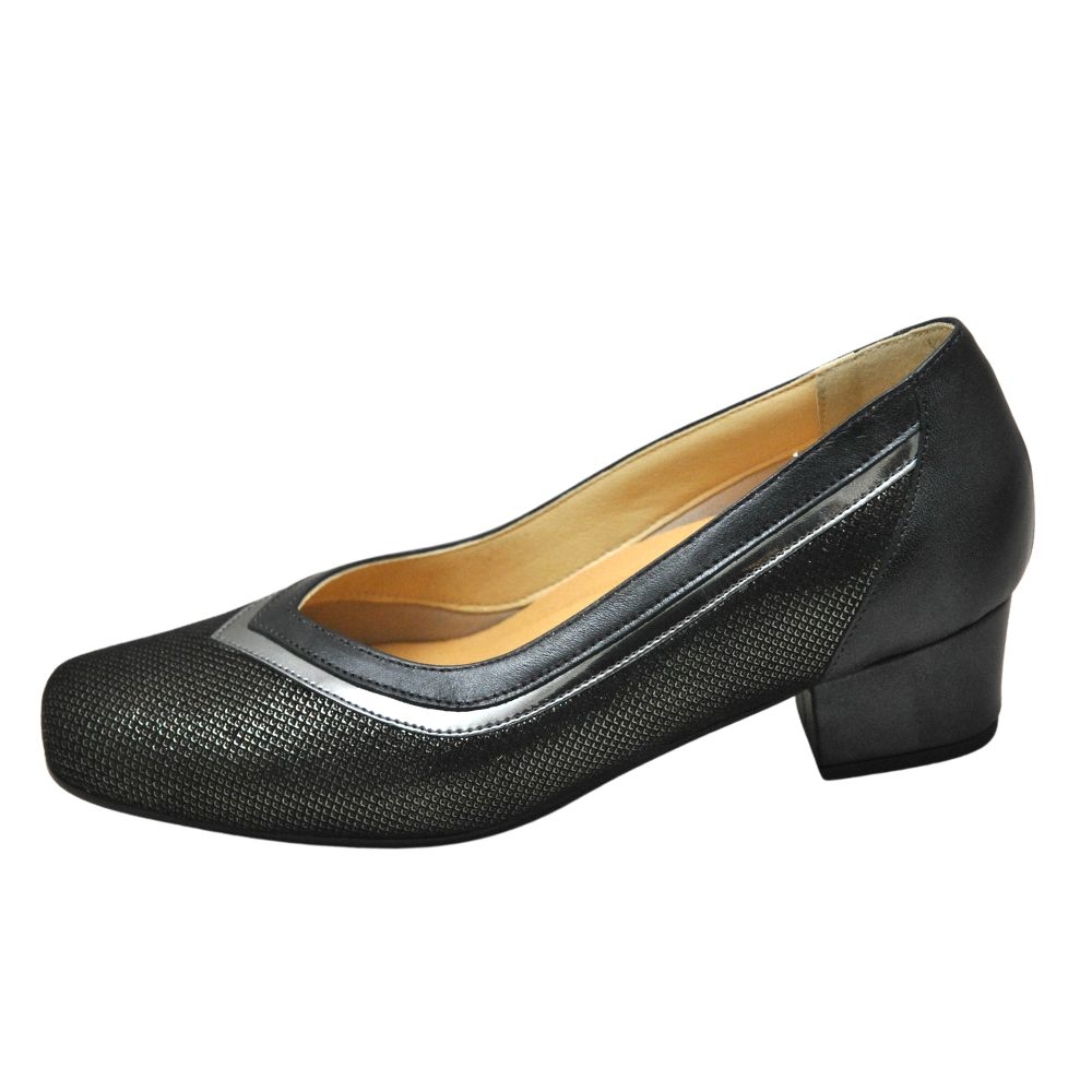 Estos zapatos de tacón para mujer de la marca Doctor Cutillas están diseñados en color negro con reflejos y una franja de color plata envejecida. Han sido fabricados con materiales textiles y piel de alta calidad y cuentan con medidas especiales de ancho para pies complicados. La puntera y el talón están cerrados para mayor protección. Además, la plantilla es acolchada y extraíble para garantizar una gran comodidad, y es posible adaptar todo tipo de plantillas ortopédicas y/o especiales. La suela es flexible, antideslizante y cuenta con un tacón ancho de aproximadamente 3 cm de altura.