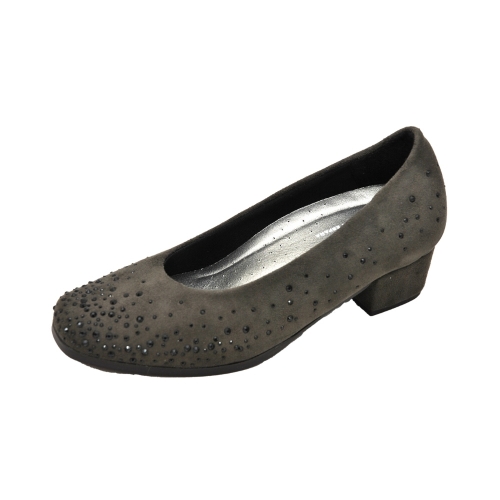 Salón con tacón para mujer, realizado en textil ante con adorno de pedrería y tacón forrado al tono. Plantilla extraíble que te permitirá el uso de una propia en caso de ser necesario. Fabricado en España.