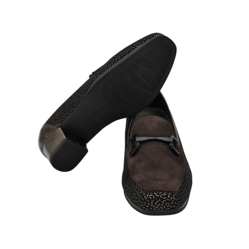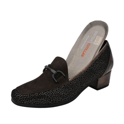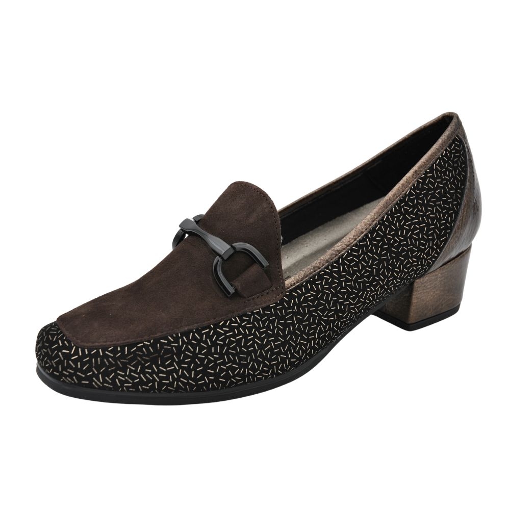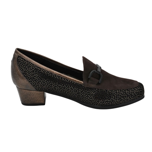 Zapato de tacón para mujer de corte salón con ancho especial. Fabricado en una combinación de piel, textil grabado con detalle de hebilla en la pala. Cuenta con el tacón forrado y plantilla de piel extraíble.