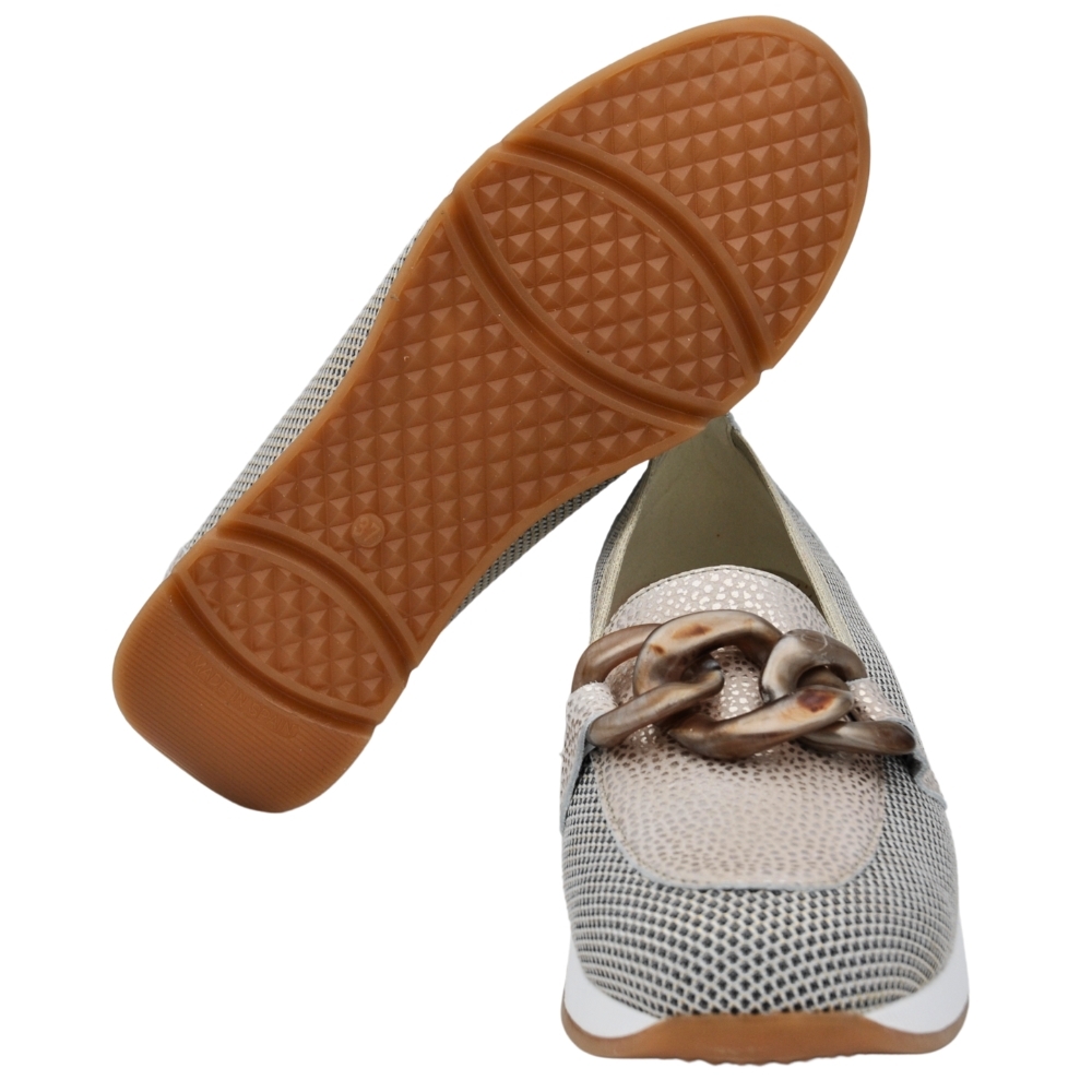 Deportivo tipo mocasín para mujer de piel y rejilla en color champagne con ribete elástico. Cuenta con empeine y talón en piel efecto coco, adorno de cadena y plantilla extraíble.