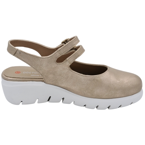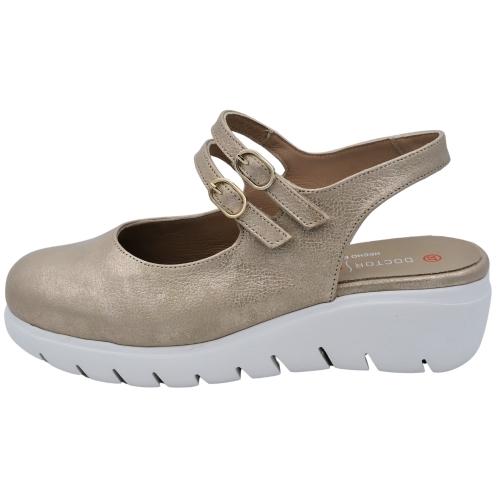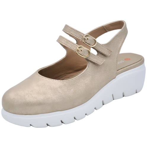 Merceditas para mujer de piel y rejilla en color champagne con doble cierre por contacto en el empeine. Cuenta con talón descubierto.