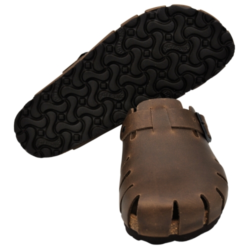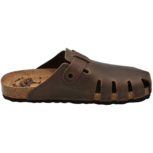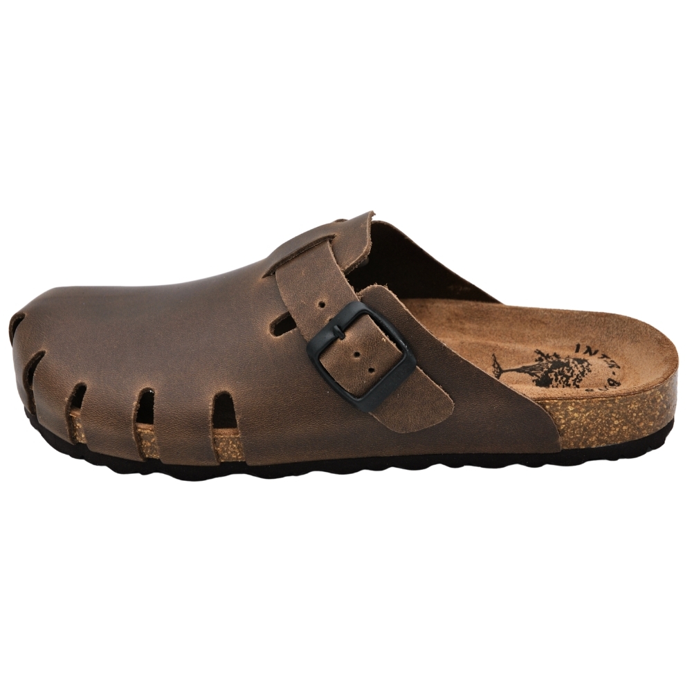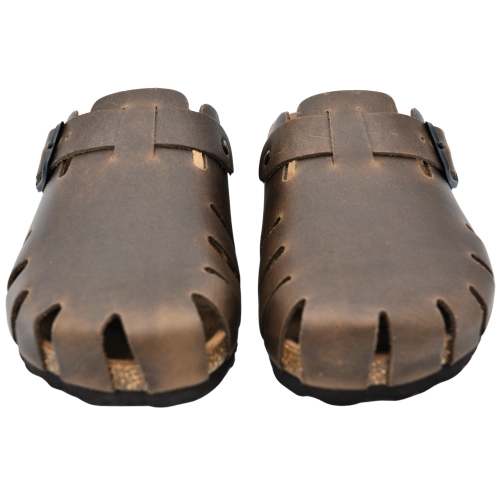 Zueco con puntera cerrad de cuña baja fabricada en piel. Fabricado en piel de primera calidad y suela de corcho-goma super comoda. Planta de piel elevada en los bordes del zapato de tal forma que te aportará una sensación de confort. Hechos en España.