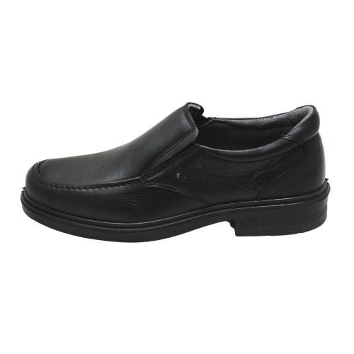 Mocasines de trabajo para hombre en color negro. Confeccionados exterior e interiormente con suave y flexible piel, resistentes a las variaciones térmicas.