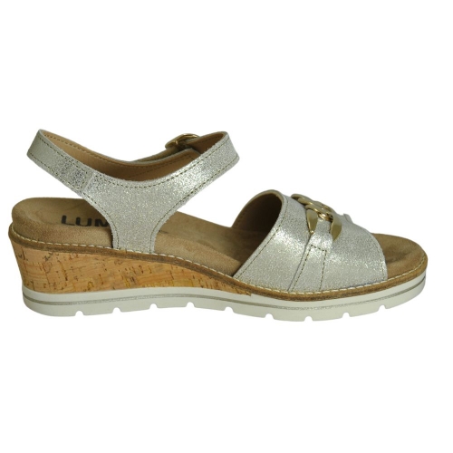 Suela con cuña de material TR y corcho bio reciclable, este tipo de componente tiene una gran absorción del impacto de la pisada y un peso muy ligero