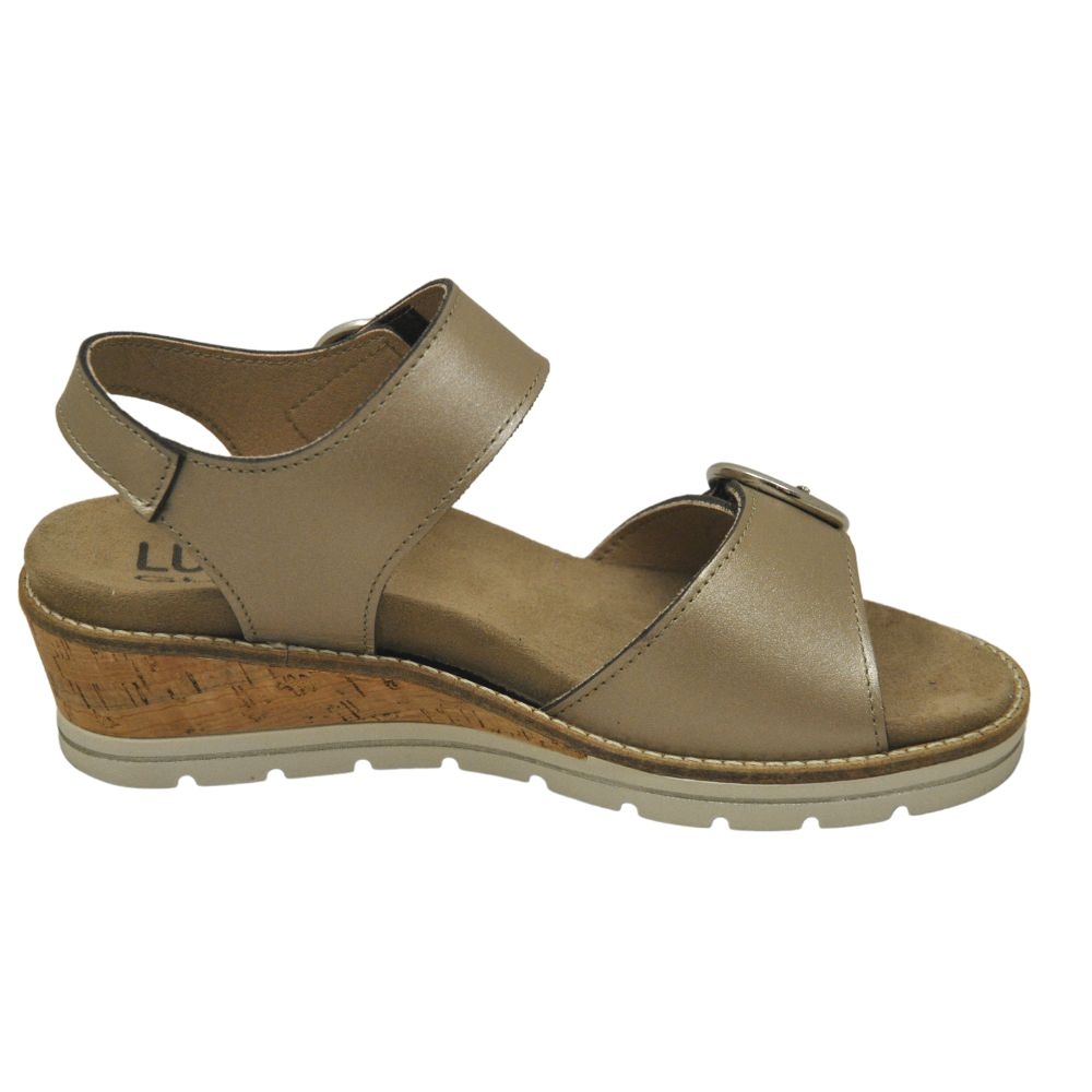 Suela con cuña de material TR y corcho bio reciclable, este tipo de componente tiene una gran absorción del impacto de la pisada y un peso muy ligero