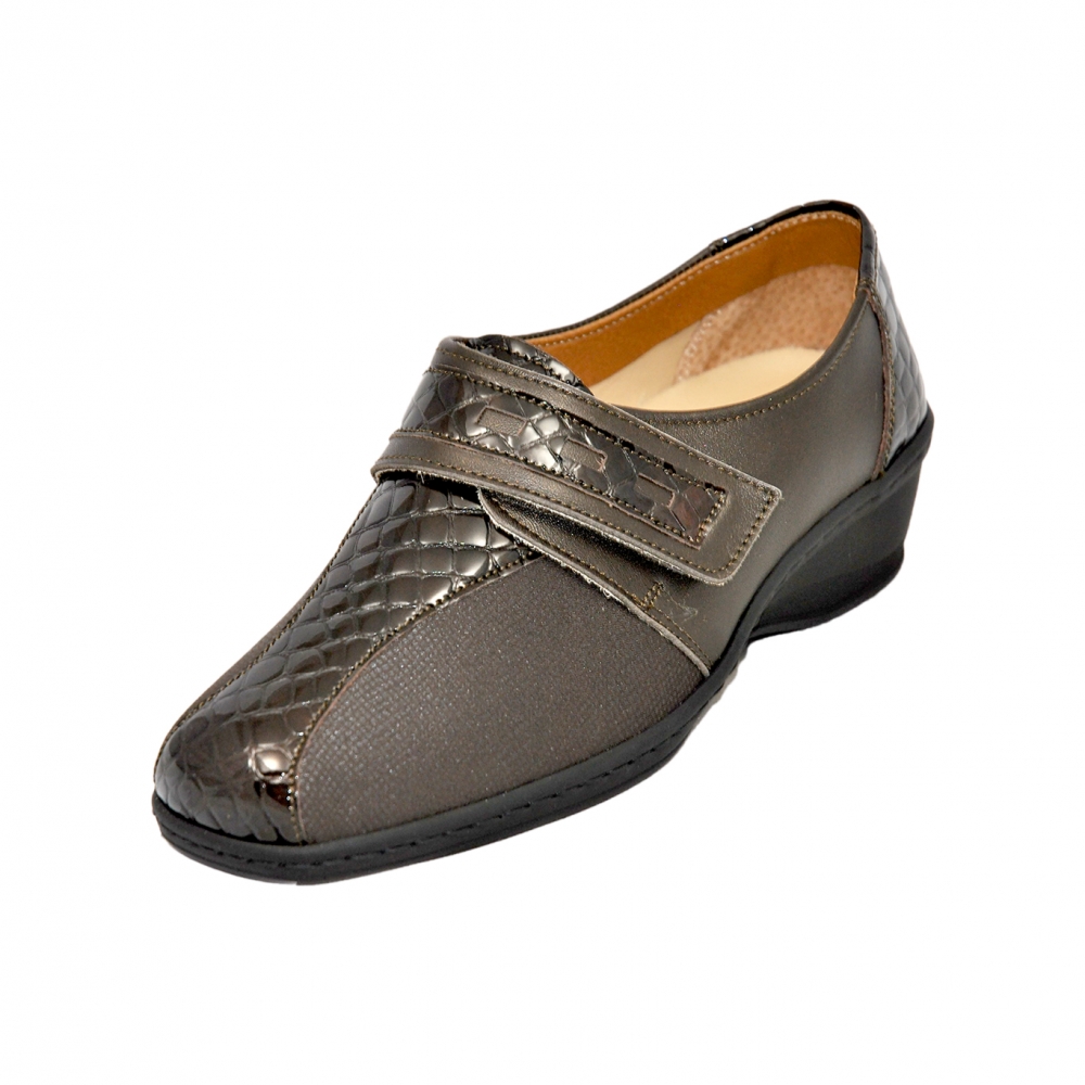 Zapato terapéutico de la marca Lumel, con apertura de velcro y pala elástica con adorno en reptil charol.