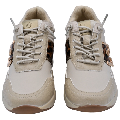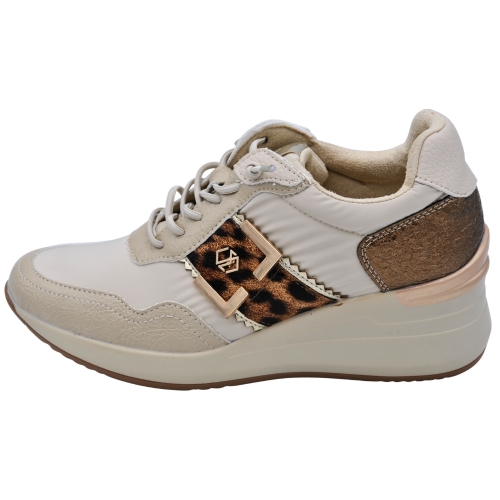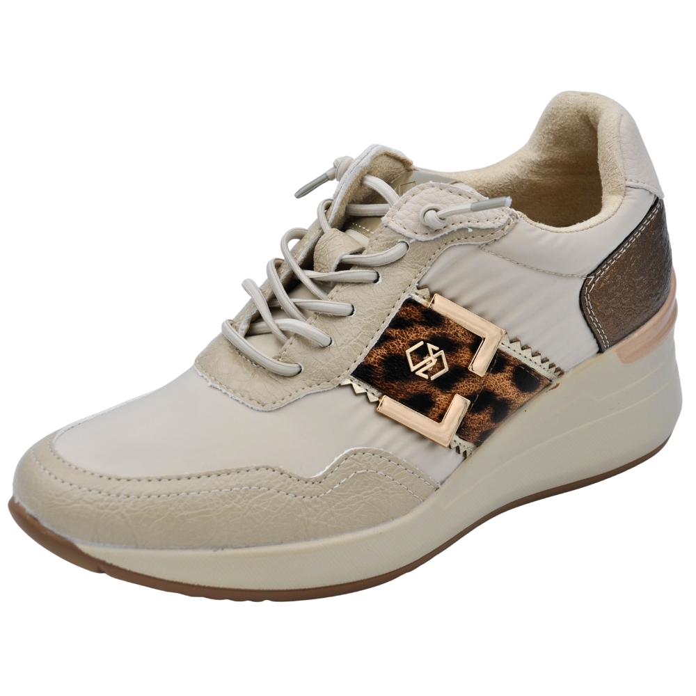 Zapatillas deportivas para mujer de PU Leather y detalles print anímal. Con cierre de cordones elásticos y cuña de unos 6cm de altura. Interior en tejido suave, con plantilla extraíble memory foam que aporta un plus a la pisada, haciéndola más cómoda.