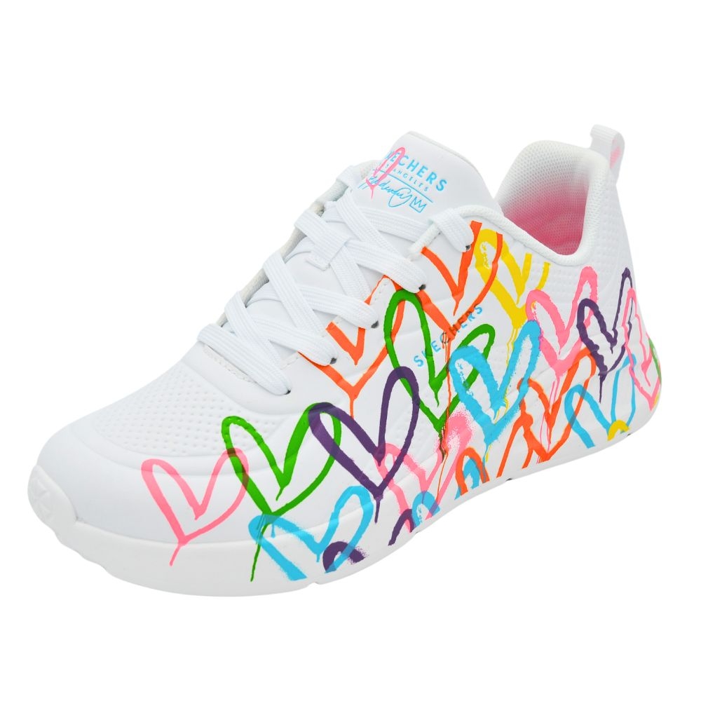 El muralista de renombre internacional James Goldcrown trae sus icónicos diseños de corazones #Lovewall a Skechers en esta inspiradora colaboración. Muestra tu estilo creativo con Skechers x JGoldcrown: Skechers Street™ Uno Lite - Heart of Hearts. Esta zapatilla de moda con cordones presenta un estampado del diseño de corazón característico del artista que se extiende hasta la suela exterior, durabuck sintético y parte superior perforada con una plantilla Skechers Air-Cooled Memory Foam®, además de una entresuela de cuña con plataforma.