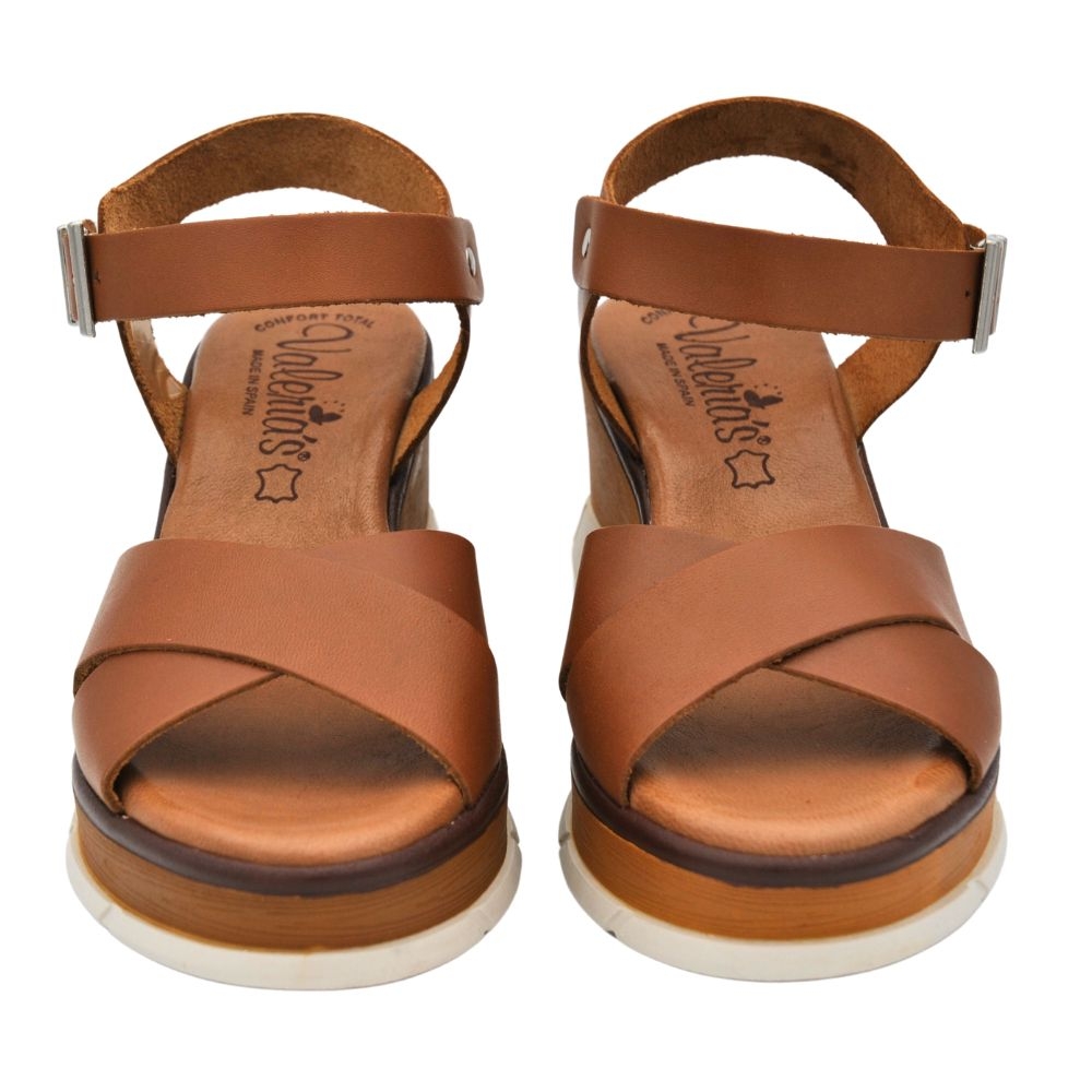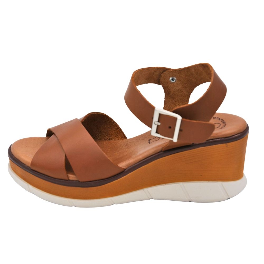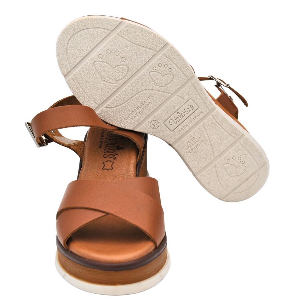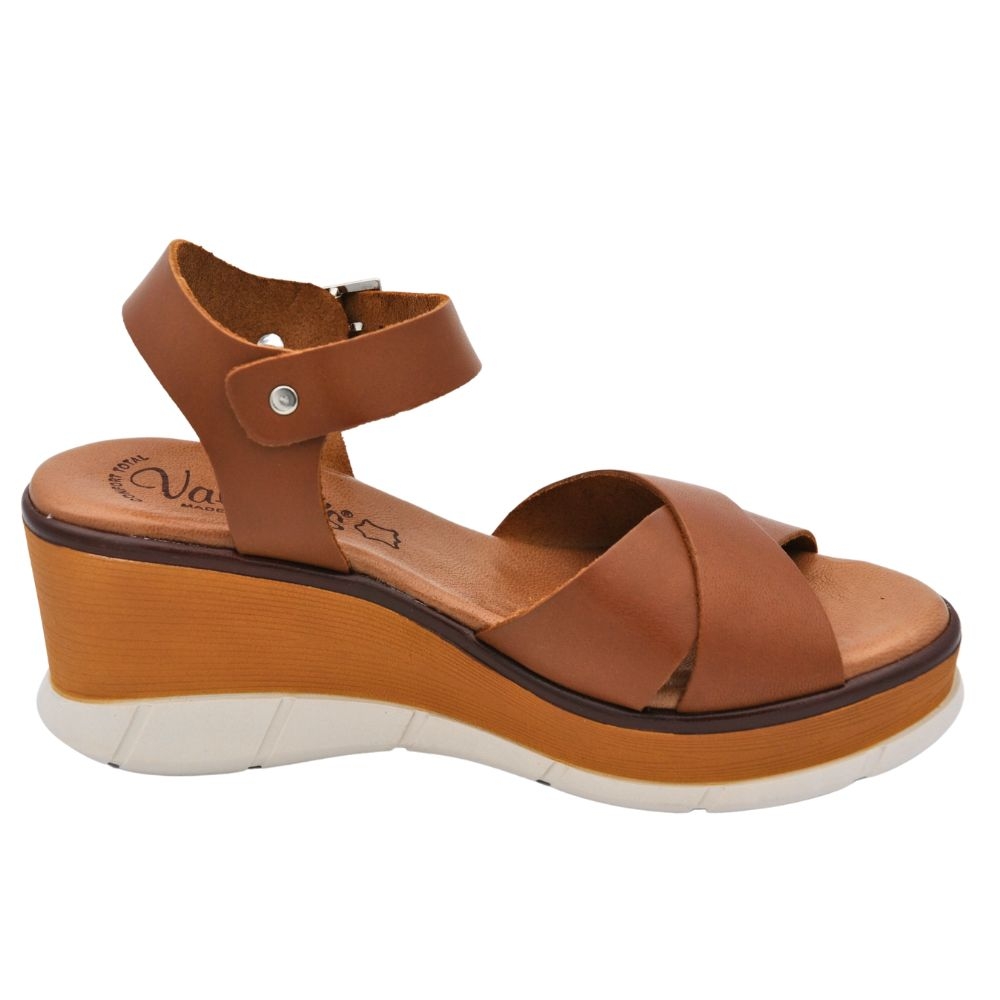 Sandalia de mujer con cuña y plataforma, sujeción con hebilla, fabricada por Valerias, modelo 1164 cuero. Como detalle de comodidad y diseño lleva la planta de gel acolchada y dos tiras anchas cruzadas en la parte delantera, una sandalia cómoda para usar este verano.