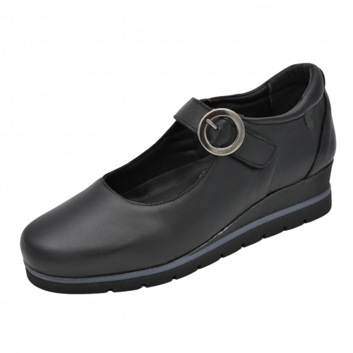 Zapato de mujer de la firma española Valeria’s Modelo 1527 en color negro, fabricado en piel de alta calidad. Cuenta con plantilla extraíble, sustituible por plantilla ortopédica, este modelo es perfecto para añadir un toque clásico, cómodo y elegante a tu colección.