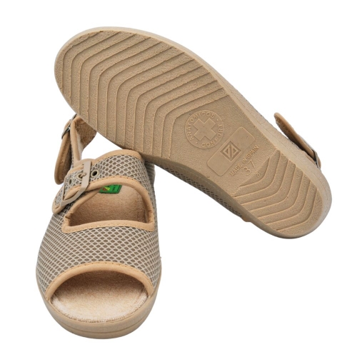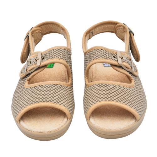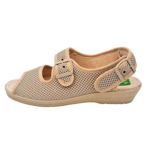 Zapatillas de casa para mujer. Modelo de puntera abierta, destalonado con un poco de cuña, fabricadas con material poroso transpirable, suela de goma antideslizante, con doble cierre de hebilla en el empeine y en el talón, que facilita el calce del zapato.