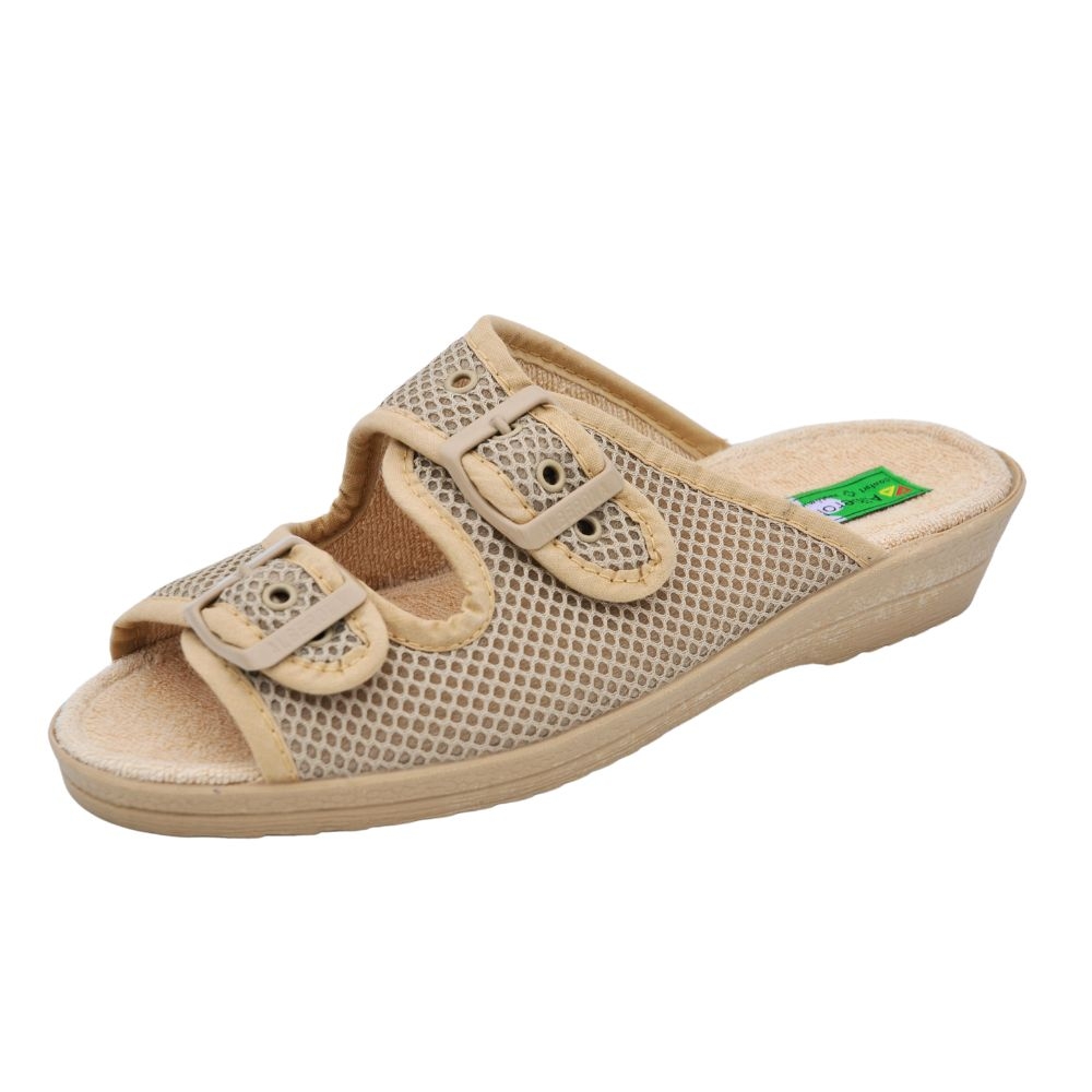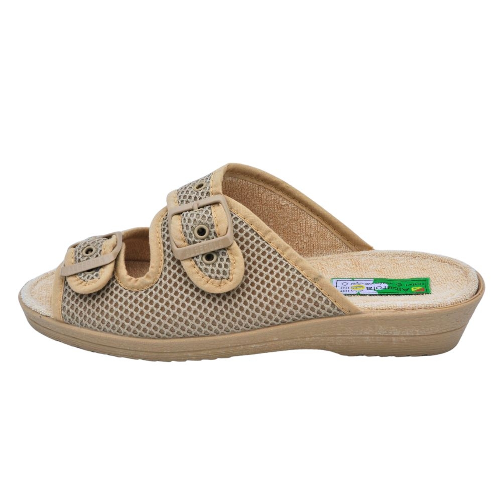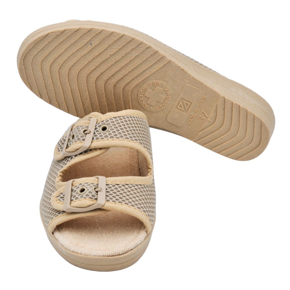 Zapatilla de casa descubierta tipo chancla con un poco de cuña y ajuste con dos hebillas, marca Alberola, modelo 4078 en color marino. Está indicada para personas con pies delicados, ya que es totalmente ajustable y por la calidad y tratamiento de sus tejidos.