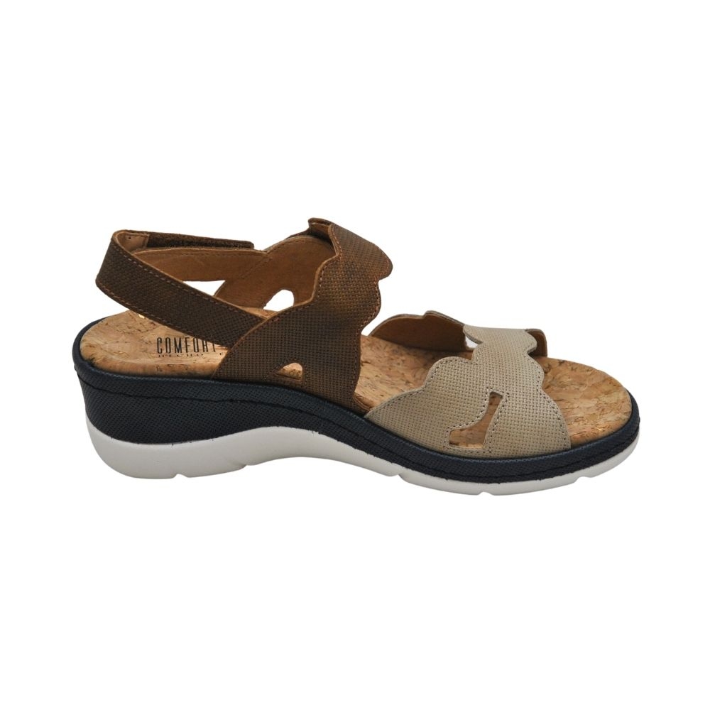 Sandalia de piel en tonos marrón y beige con plantilla extraíble sustituible por plantilla personalizada.