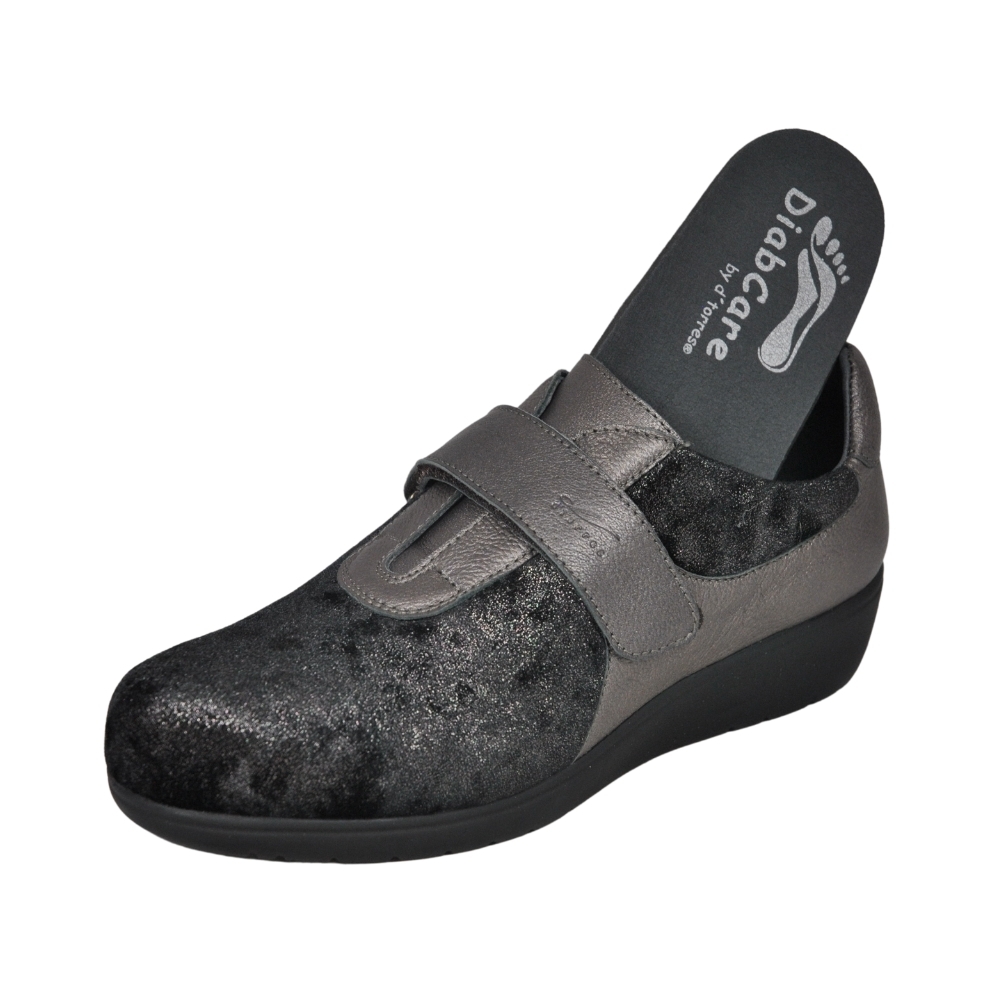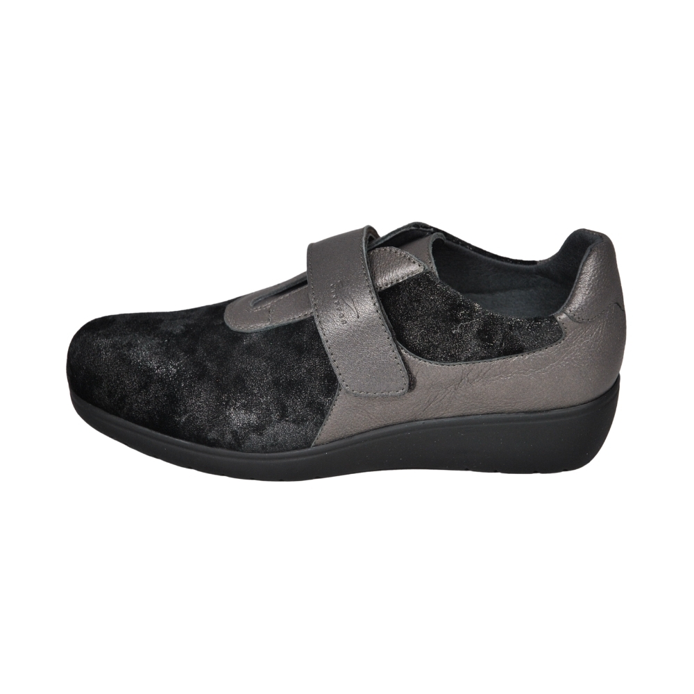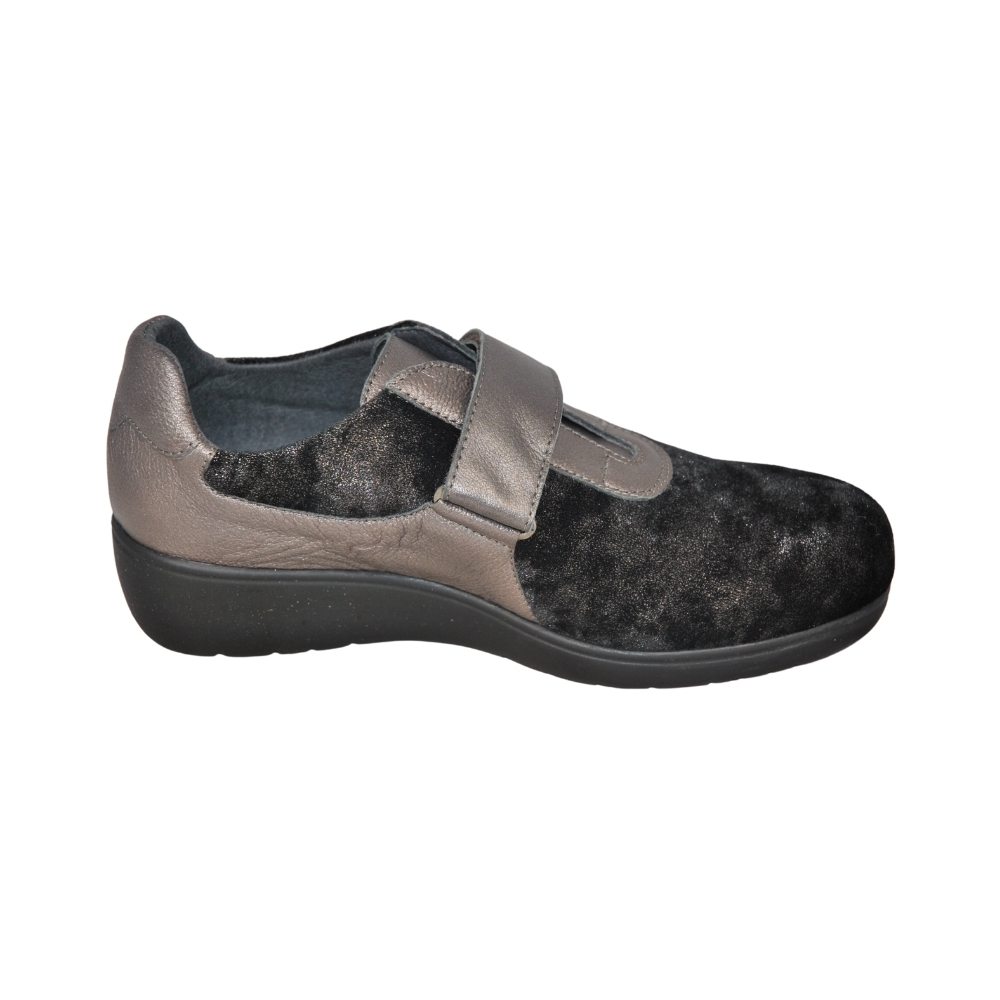 Piel y licra elástica adaptable. Ajuste con tiras de velcro en empeine. Apto para adaptar plantillas a medida, fabricados con los mejores materiales de primera calidad. Indicado para mujeres que precisan un calzado cómodo, amplio y adaptable. Las costuras internas están protegidas, evitando rozaduras y protegiendo los pies más sensibles y delicados.