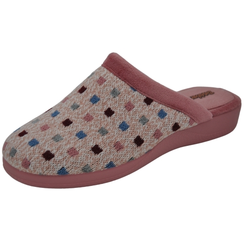 DeValverde 1159. Zapatillas para el hogar destalonadas, elaboradas en fieltro textil, con estampado de "cuadrados" en cada zapatilla y suela de goma antideslizante. Hechas en España.