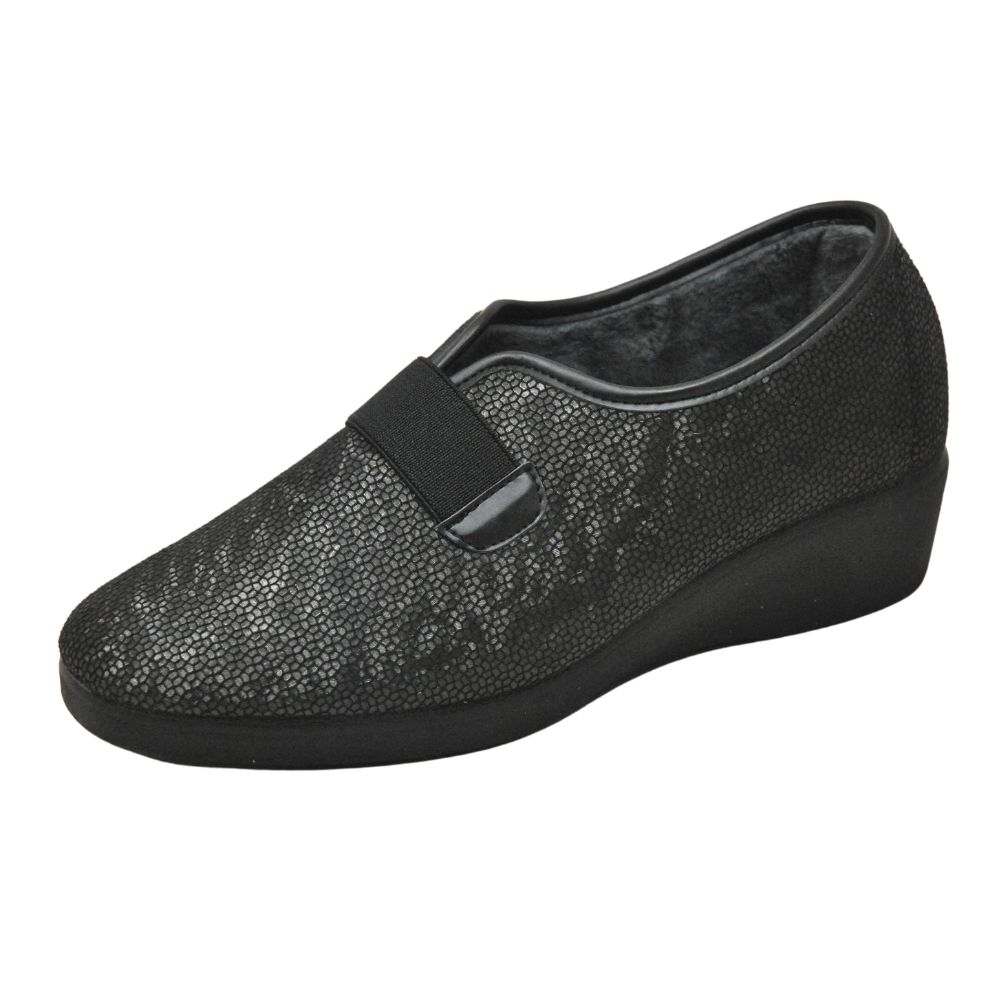 Zapatilla de casa cerrada para mujer, con cuña baja. Elástico al empeine. Zapatillas relajantes, termoestables, flexibles, lavables y antibacterias. Suela de goma antideslizante. Color marrón. Altura cuña 4 cm. Confort en tus pies. Hecho en España.
