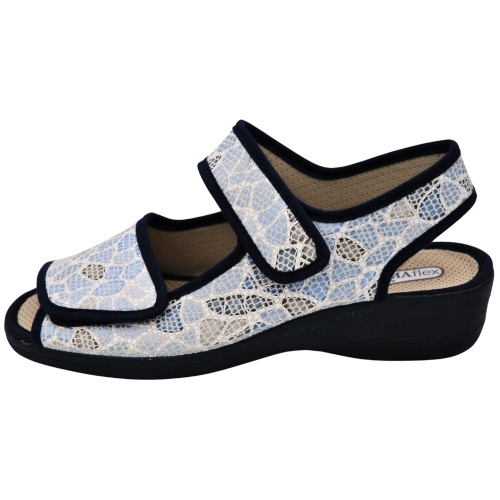 Pantuflas de casa con talón abierto y dedos fuera con cuña de 4.5cm, de la marca DeValverde 2796 color marino, tiene dos cierres adhesivos, uno el tobillo y otro en el empeine ideal para pies anchos. Forro interior en textil y suela caucho natural (latex). Chinela Ideal para mantener tus pies frescos en verano. Zapatilla de casa para mujer, piso con grabado especial rugoso para evitar posibles deslizamientos. Babucha fabricada con tejidos en microfibras y algodón que permiten una constante ventilación. Relleno de corcho natural para una total absorción de los posibles impactos. Respetuosos con la naturaleza. Utilizando materiales que cuidan al máximo posible el medio ambiente. Hecho en España.