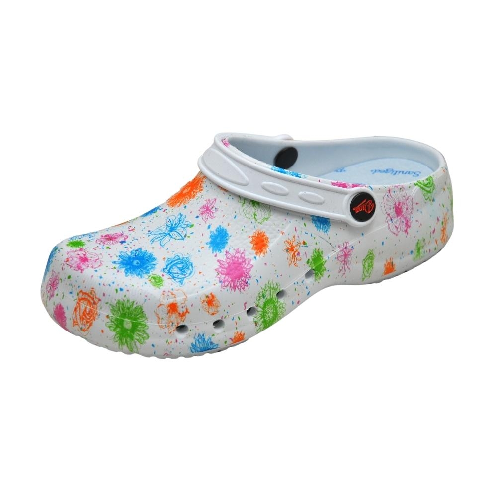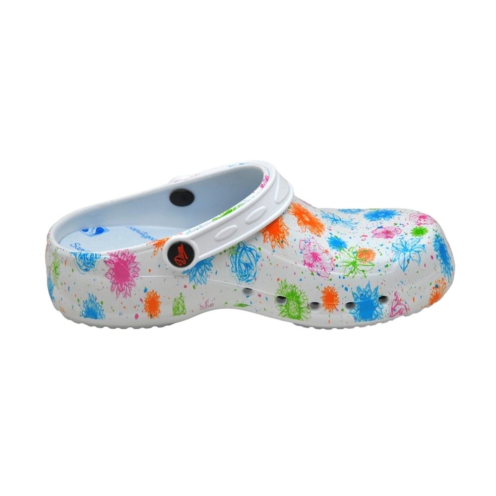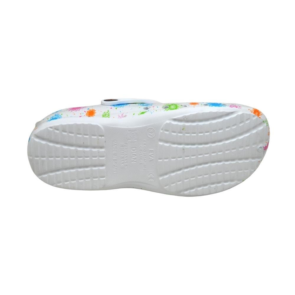 Zueco ultraligero de EVA estampado, anti-bacteriano, libre de látex, mono-casco, anatómico y antideslizante. Apto para lavado en lavadora hasta 40º. Con correa posterior abatible entre el talón y la pala, perforado en los laterales para facilitar la transpiración, la limpieza y evitar la penetración directa dentro del zueco de líquidos o fluidos. Planta con micro-puntos de masaje para estimular la circulación sanguínea. Incorpora una plantilla interior de tejido sobre espuma de latex con tratamiento anti-bacterias. ULTRALIGERO, solo 180 gramos el par.