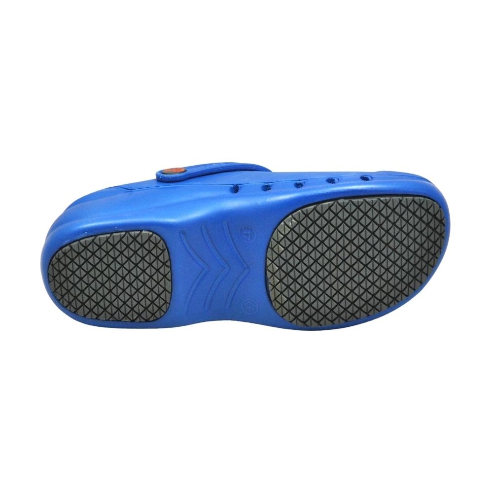 Zueco ligero de EVA, anti-bacteriano, con celdillas antideslizantes en la suela, mono-casco, anatómico y antideslizante. Apto para lavado en lavadora hasta 40º. Con correa posterior abatible entre el talón y la pala, perforado en los laterales para facilitar la transpiración, la limpieza y evitar la penetración directa dentro del zueco de líquidos. Planta con micro-puntos de masaje para estimular la circulación sanguínea. Incorpora una plantilla interior de tejido sobre espuma de latex con tratamiento anti-bacterias.