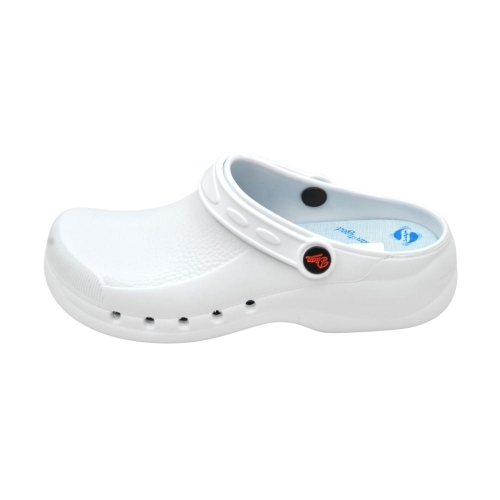 Zueco ligero de EVA, anti-bacteriano, con celdillas antideslizantes en la suela, mono-casco, anatómico y antideslizante. Apto para lavado en lavadora hasta 40º. Con correa posterior abatible entre el talón y la pala, perforado en los laterales para facilitar la transpiración, la limpieza y evitar la penetración directa dentro del zueco de líquidos. Planta con micro-puntos de masaje para estimular la circulación sanguínea. Incorpora una plantilla interior de tejido sobre espuma de latex con tratamiento anti-bacterias.