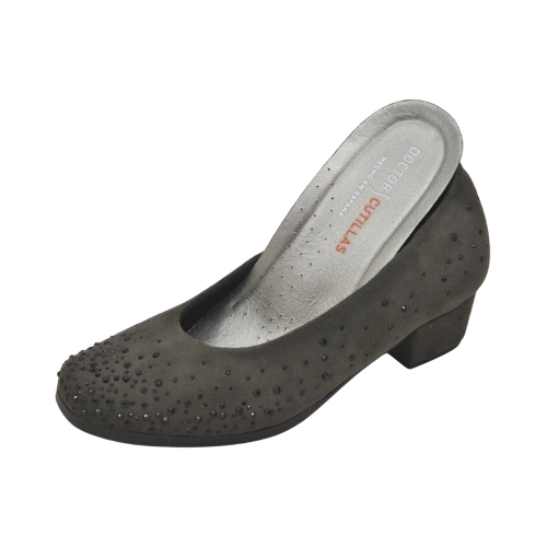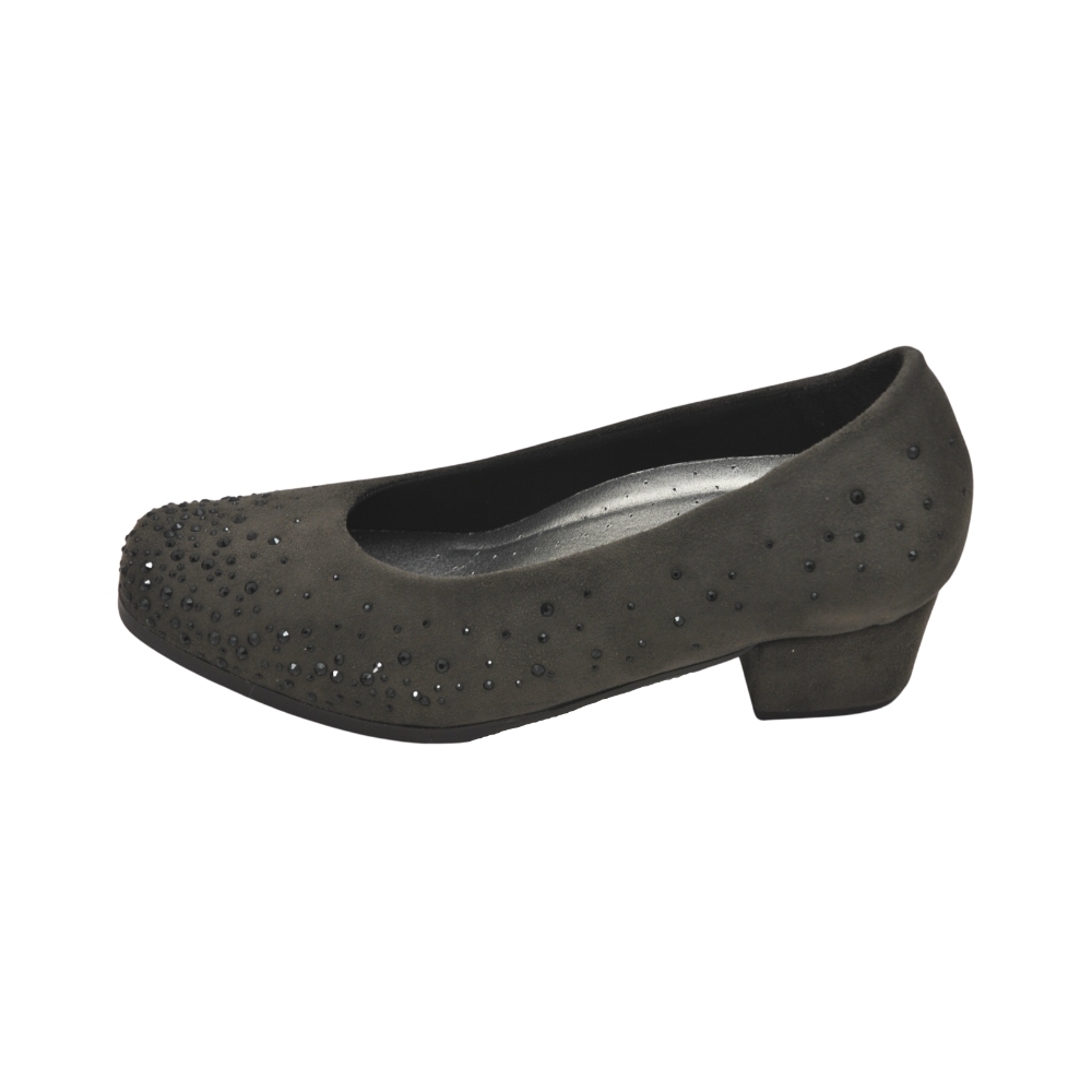 Salón con tacón para mujer, realizado en textil ante con adorno de pedrería y tacón forrado al tono. Plantilla extraíble que te permitirá el uso de una propia en caso de ser necesario. Fabricado en España.