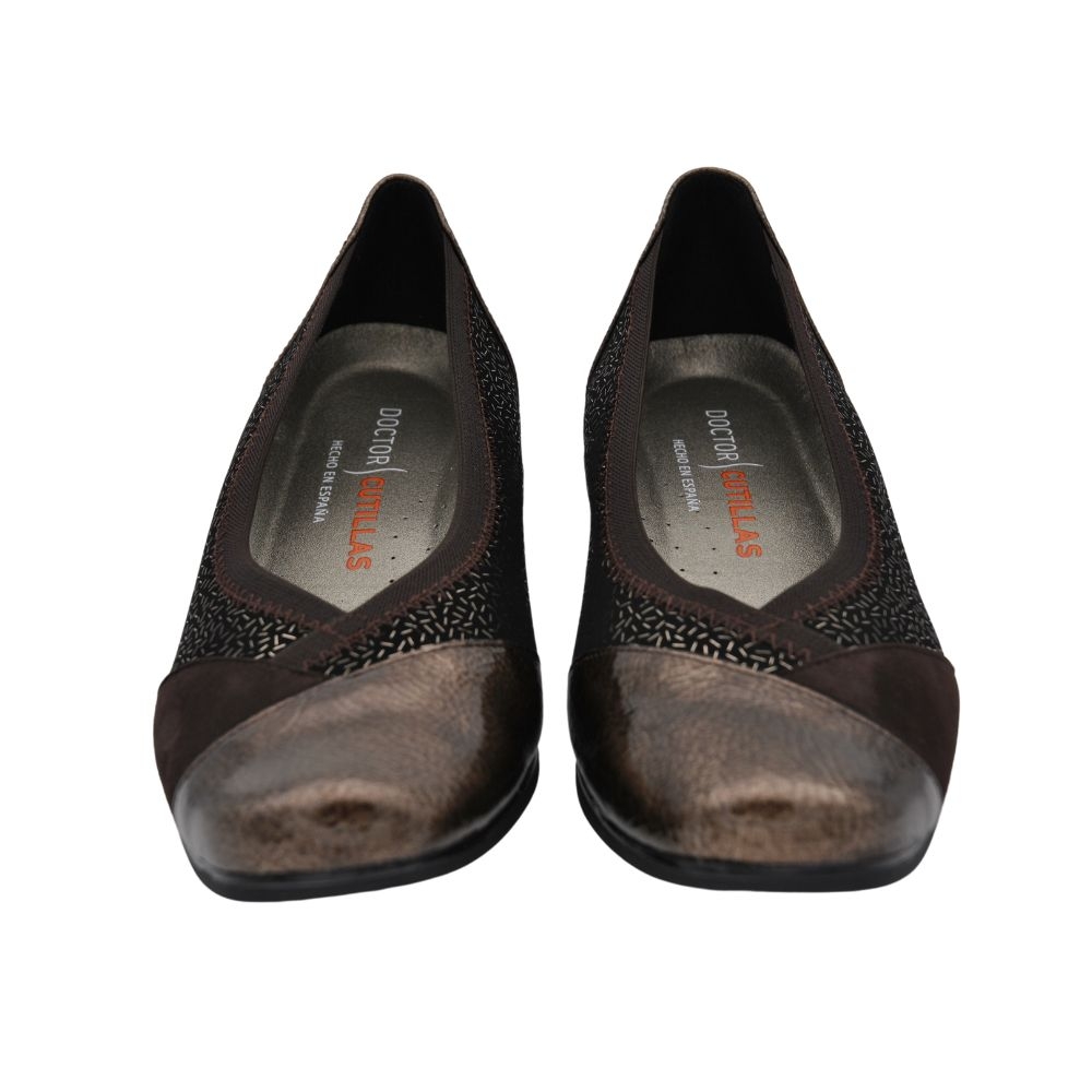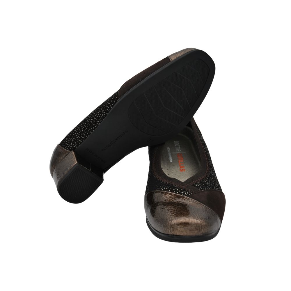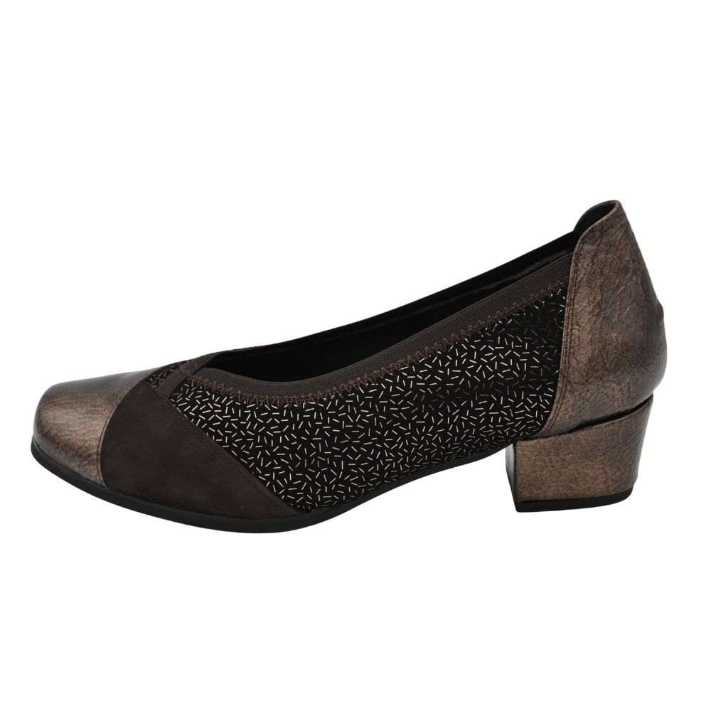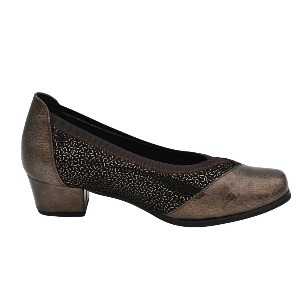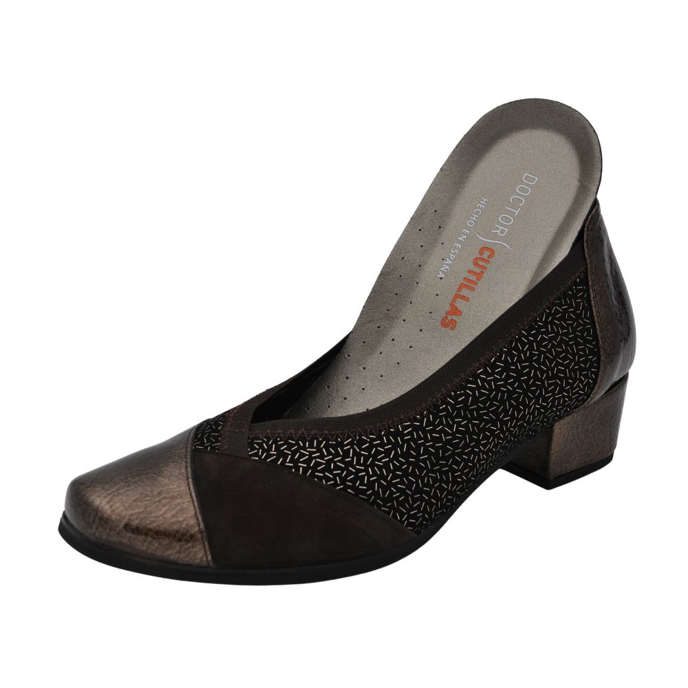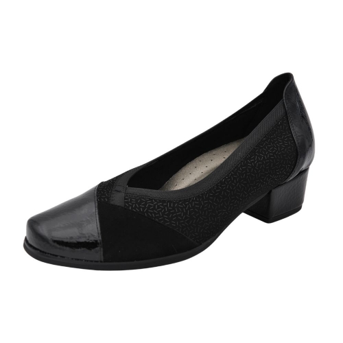 Zapato de tacón para mujer de corte salón con ancho especial en color negro. Fabricado en una combinación de piel, textil con grabado y elásticos cruzados. Cuenta con el tacón forrado y plantilla de piel extraíble.