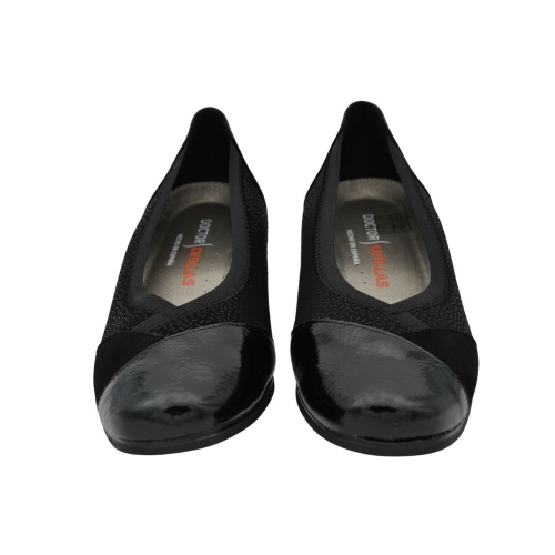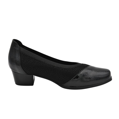 Zapato de tacón para mujer de corte salón con ancho especial en color negro. Fabricado en una combinación de piel, textil con grabado y elásticos cruzados. Cuenta con el tacón forrado y plantilla de piel extraíble.