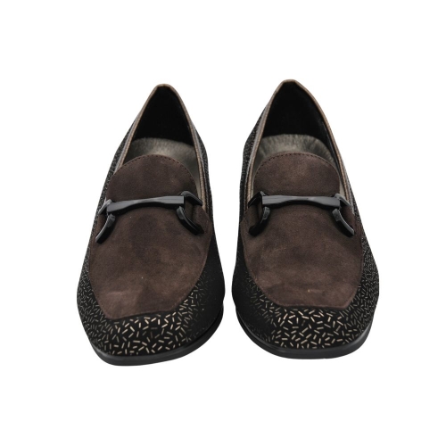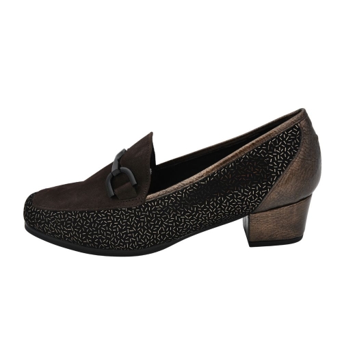 Zapato de tacón para mujer de corte salón con ancho especial. Fabricado en una combinación de piel, textil grabado con detalle de hebilla en la pala. Cuenta con el tacón forrado y plantilla de piel extraíble.