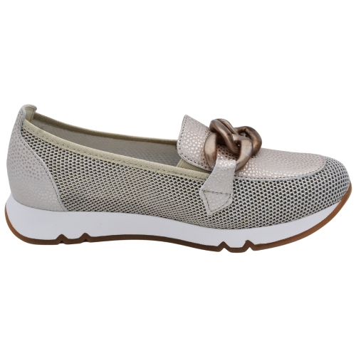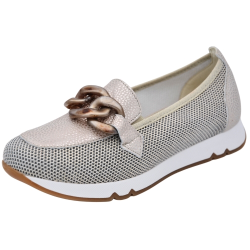 Deportivo tipo mocasín para mujer de piel y rejilla en color champagne con ribete elástico. Cuenta con empeine y talón en piel efecto coco, adorno de cadena y plantilla extraíble.