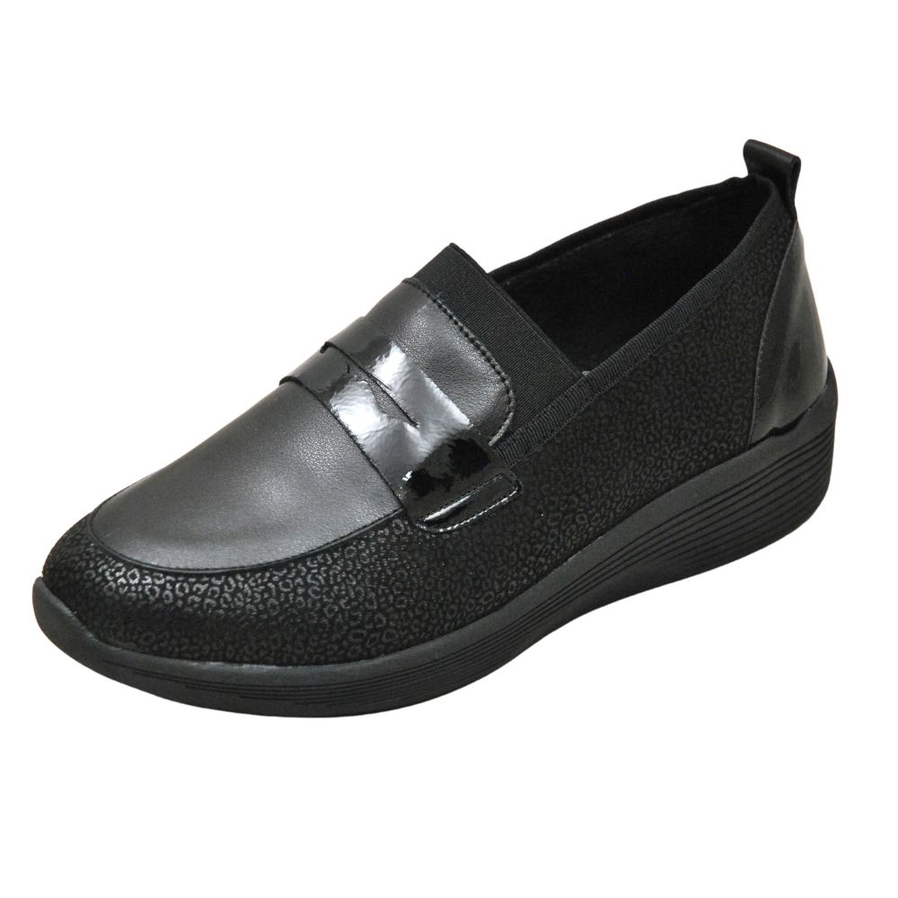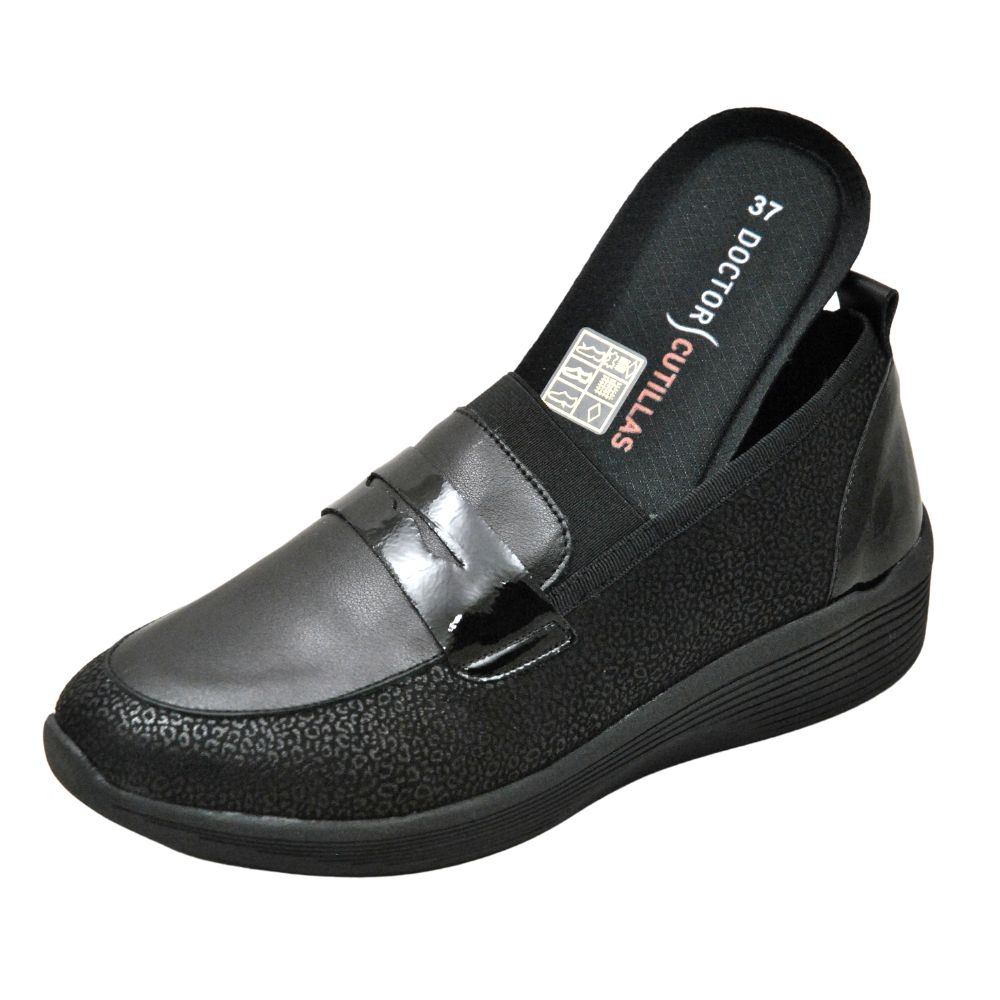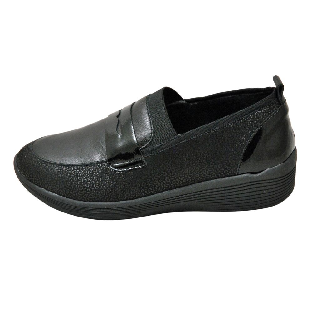 combinada con licra grabada y detalles con efecto charol. Suela de cuña, forro