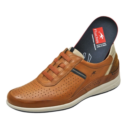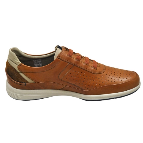 Zapato cómodo de hombre, estilo casual. Cierre de cordones elásticos. Sneakers fabricados en piel natural troquelada, con suela de goma flexible y ligera. Plantilla acolchada y extraíble. Color cuero. Comodidad Absoluta. Hecho en España.