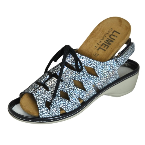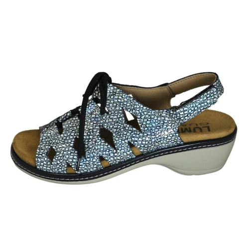 Empeine con cordones en la parte superior para facilitar el calce y ampliar la anchura. Tira trasera con cierre de velcro.