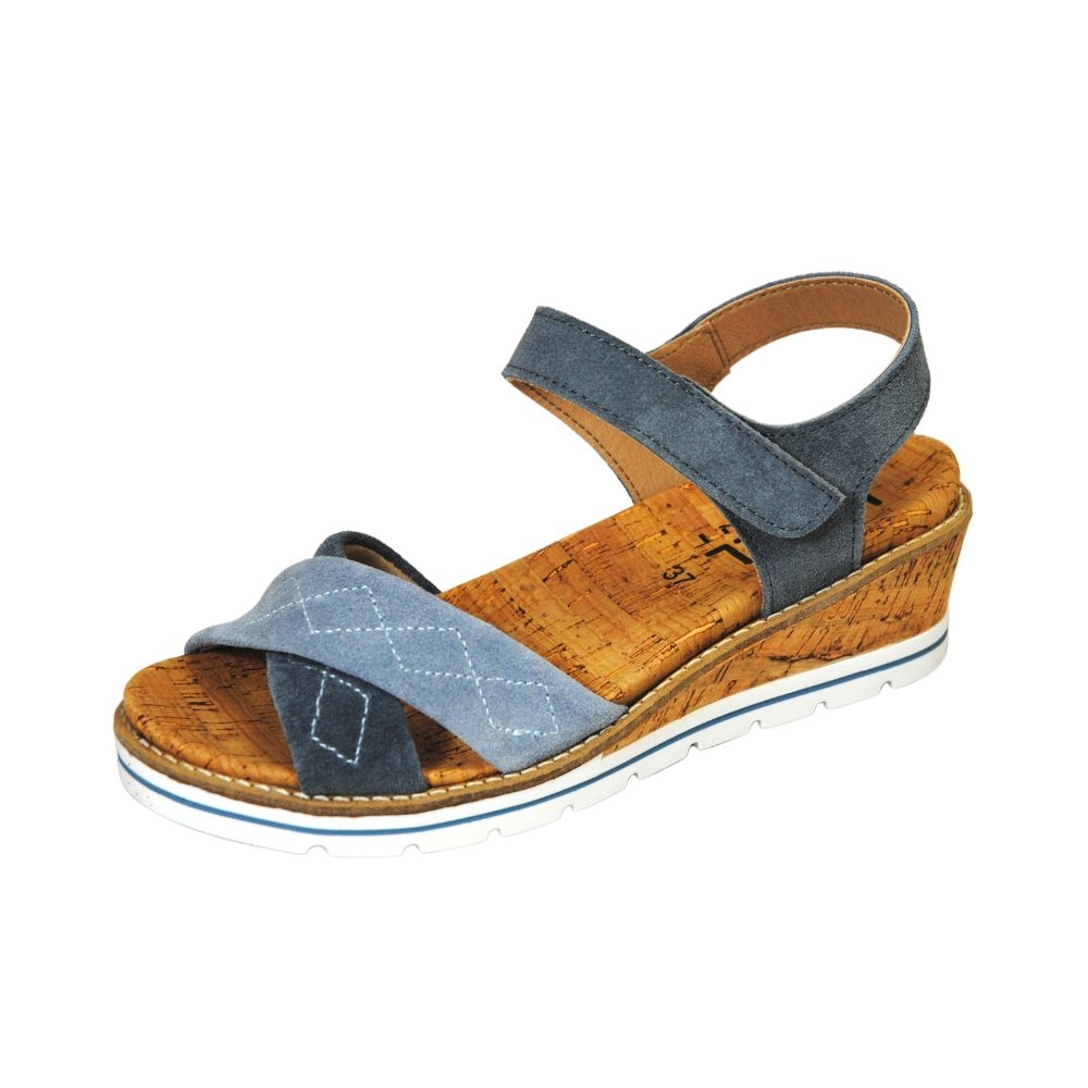 Suela con cuña de material TR y corcho bio reciclable, este tipo de componente tiene una gran absorción del impacto de la pisada y un peso muy ligero