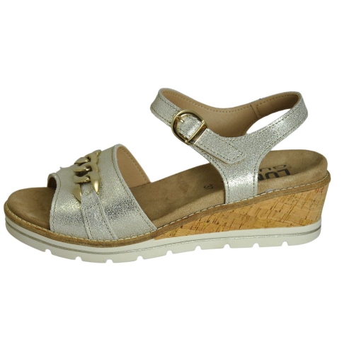 Suela con cuña de material TR y corcho bio reciclable, este tipo de componente tiene una gran absorción del impacto de la pisada y un peso muy ligero