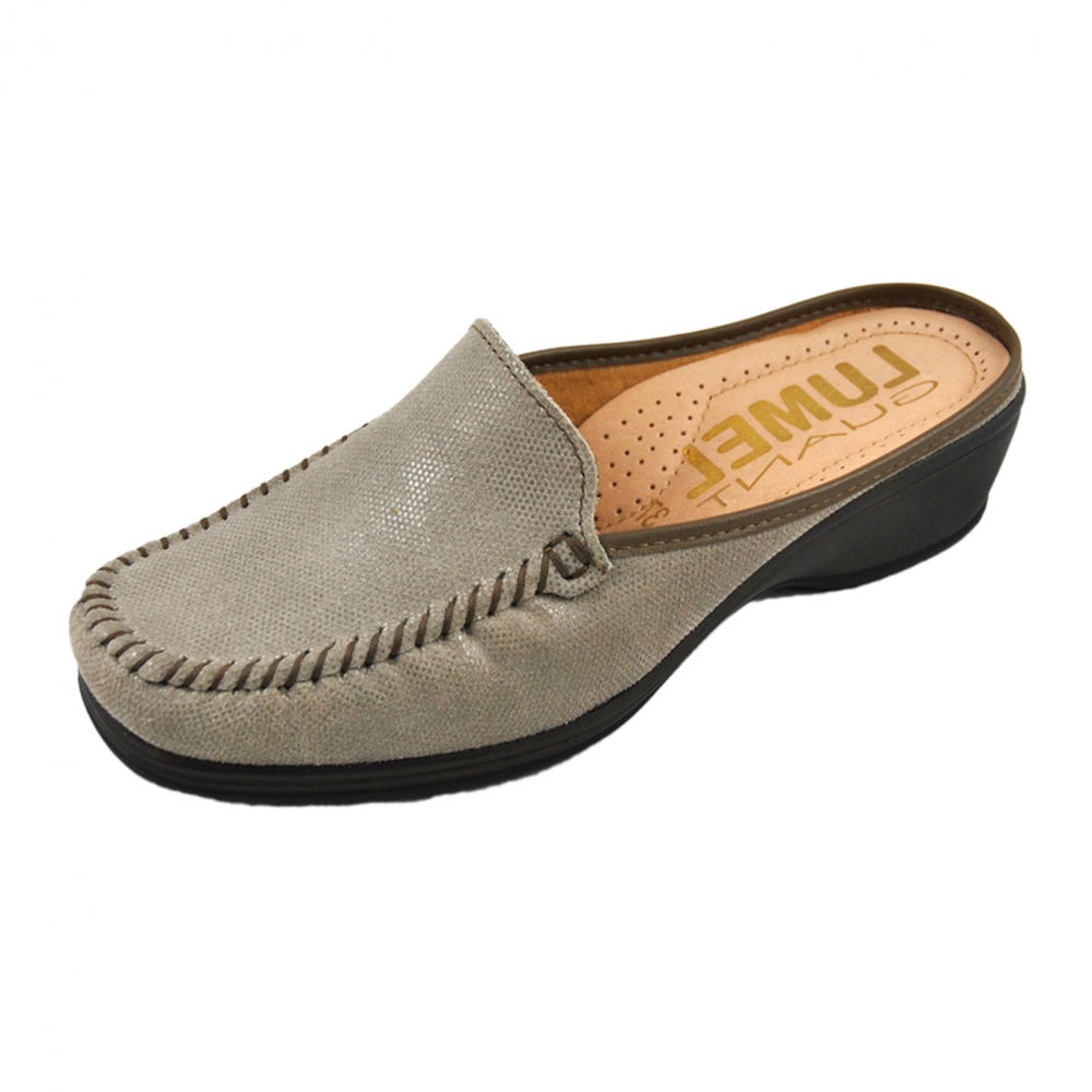 Mocasín descubierto por detrás de mujer realizado en fabricación KIOWA, este sistema de producción, derivado de los mocasines que usaban las tribus indígenas de América del Norte y Canadá, tiene como característica que consta principalmente de dos piezas, la parte alta del empeine y el resto del cuerpo del corte, que vuelve desde el exterior hasta el interior del pie incluido la planta. Unidos únicamente por los cosidos característicos a esta fabricación.