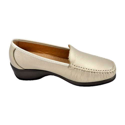 Mocasín de mujer realizado en fabricación KIOWA, este sistema de producción, derivado de los mocasines que usaban las tribus indígenas de América del Norte y Canadá, tiene como característica que consta principalmente de dos piezas, la parte alta del empeine y el resto del cuerpo del corte, que vuelve desde el exterior hasta el interior del pie incluido la planta. Unidos únicamente por los cosidos característicos a esta fabricación.