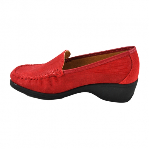 Mocasín de mujer realizado en fabricación KIOWA, este sistema de producción, derivado de los mocasines que usaban las tribus indígenas de América del Norte y Canadá, tiene como característica que consta principalmente de dos piezas, la parte alta del empeine y el resto del cuerpo del corte, que vuelve desde el exterior hasta el interior del pie incluido la planta. Unidos únicamente por los cosidos característicos a esta fabricación.