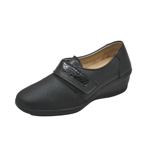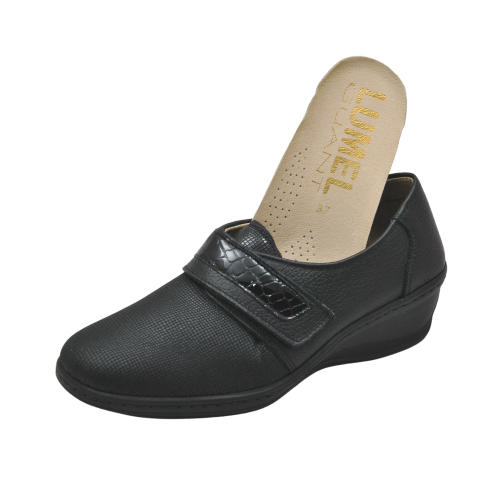 Zapato terapéutico de la marca Lumel, con apertura de velcro y pala elástica con adorno en reptil charol.