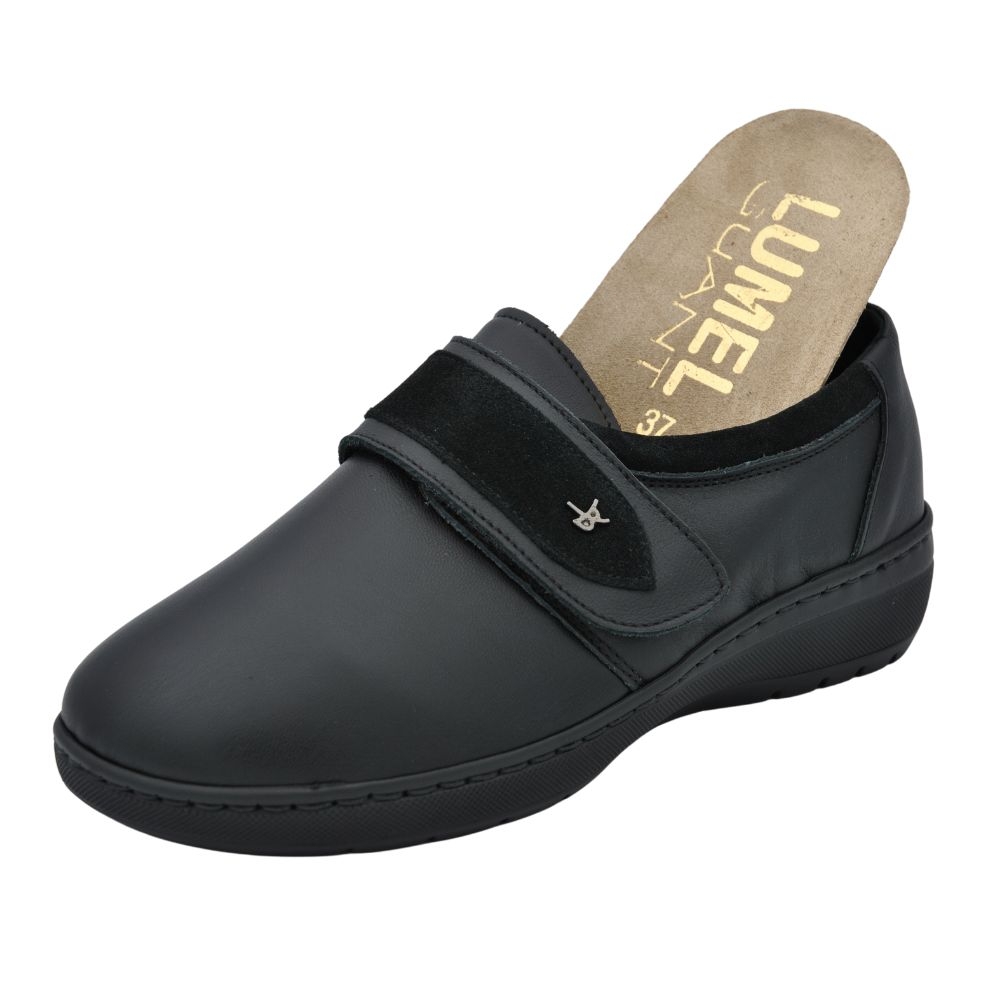 Zapato terapéutico de la marca Lumel Modelo 7118-5256 ELASTICA/NAPPA/SASSO en Color NEGRO, con apertura de velcro y pala elástica con adorno en reptil charol.