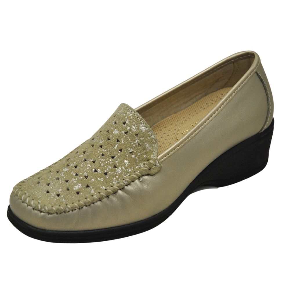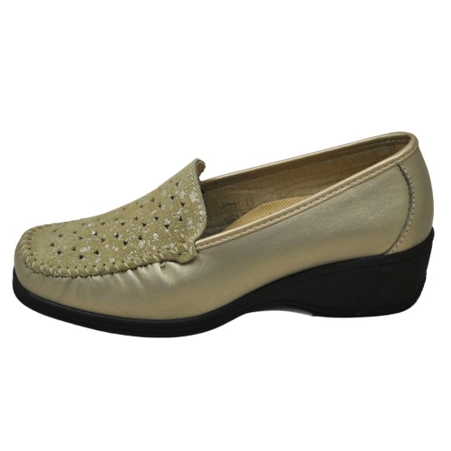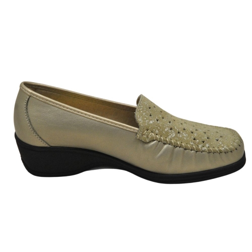 Mocasín de mujer realizado en fabricación KIOWA, este sistema de producción, derivado de los mocasines que usaban las tribus indígenas de América del Norte y Canadá, tiene como característica que consta principalmente de dos piezas, la parte alta del empeine y el resto del cuerpo del corte, que vuelve desde el exterior hasta el interior del pie incluido la planta. Unidos únicamente por los cosidos característicos a esta fabricación.
