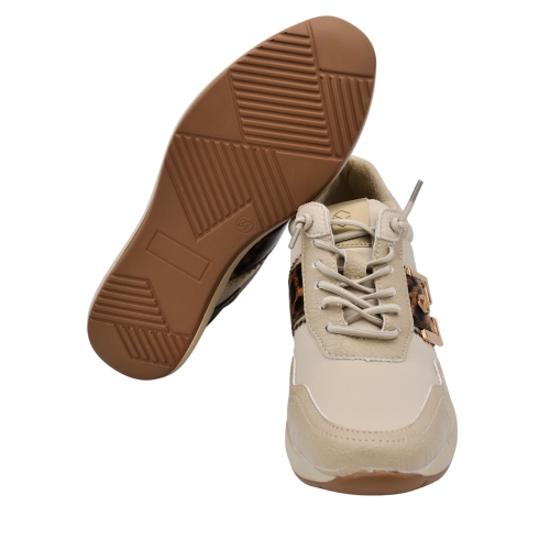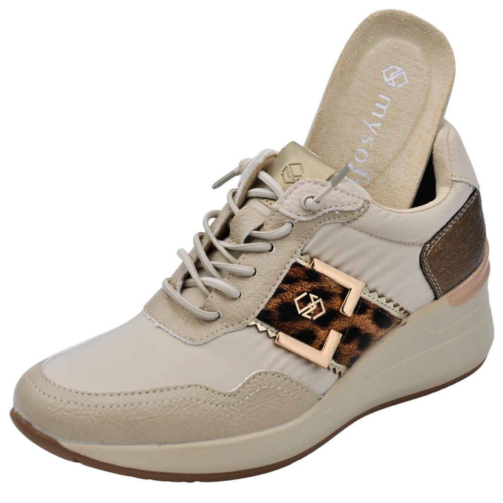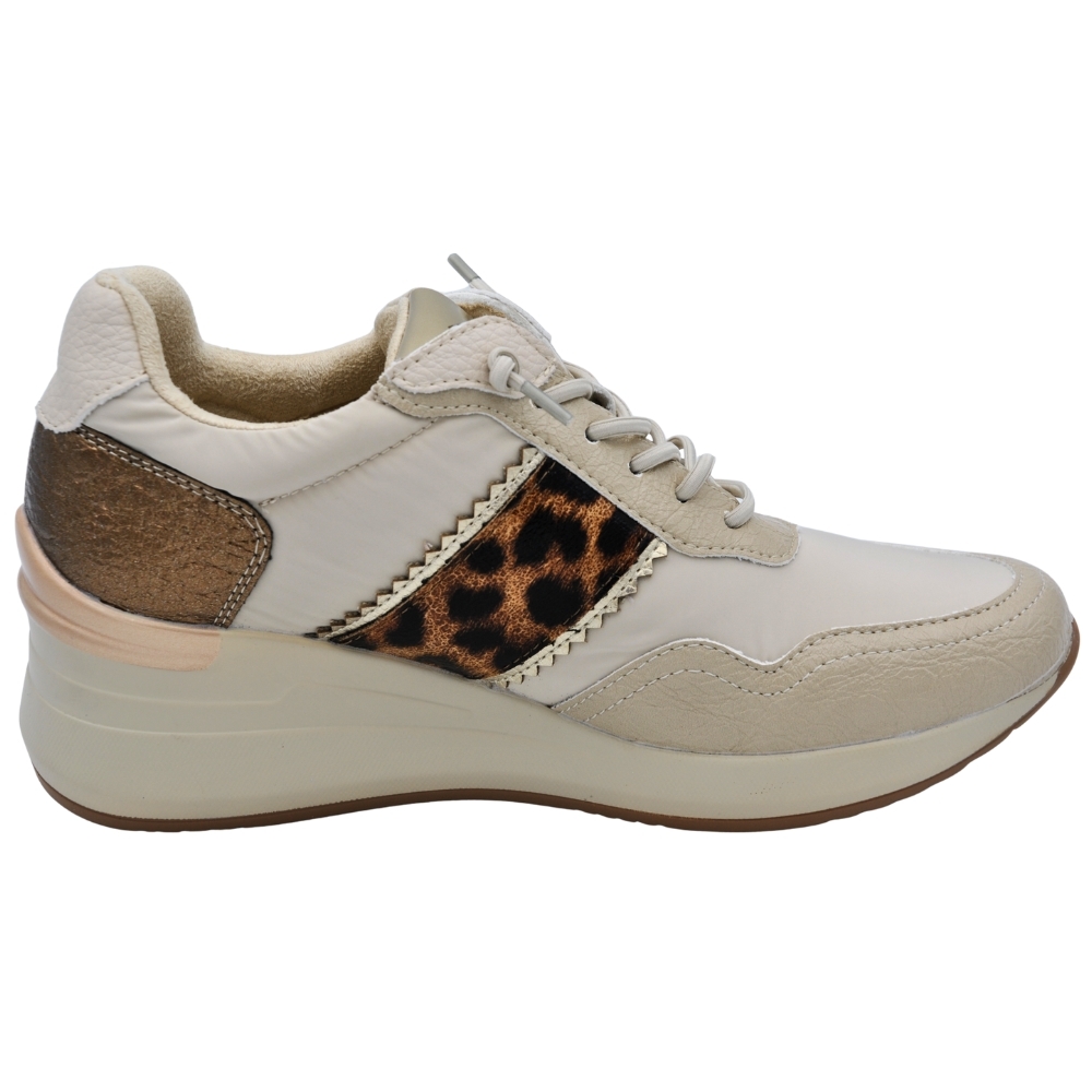 Zapatillas deportivas para mujer de PU Leather y detalles print anímal. Con cierre de cordones elásticos y cuña de unos 6cm de altura. Interior en tejido suave, con plantilla extraíble memory foam que aporta un plus a la pisada, haciéndola más cómoda.