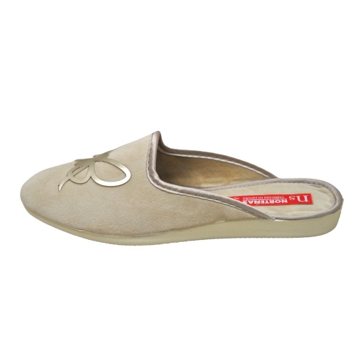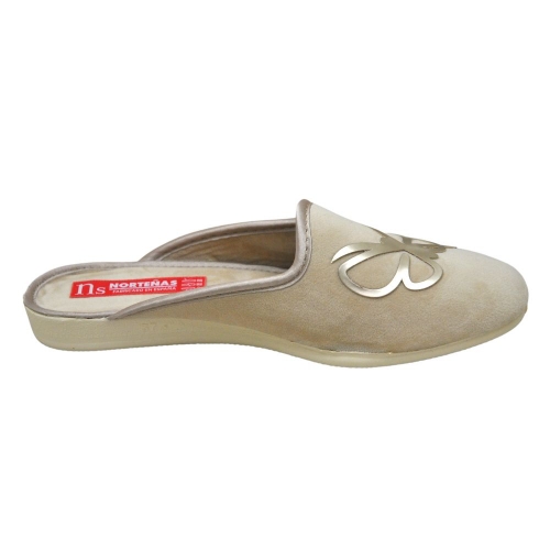 Zapatillas de casa abiertas para Mujer, de la marca Norteñas. Cuenta con un elegante adorno de una mariposa en la parte frontal. Elegante modelo con interior cálido. Suela antideslizante. Color BEIG. Modelo 12-725-65. Fabricadas en España.