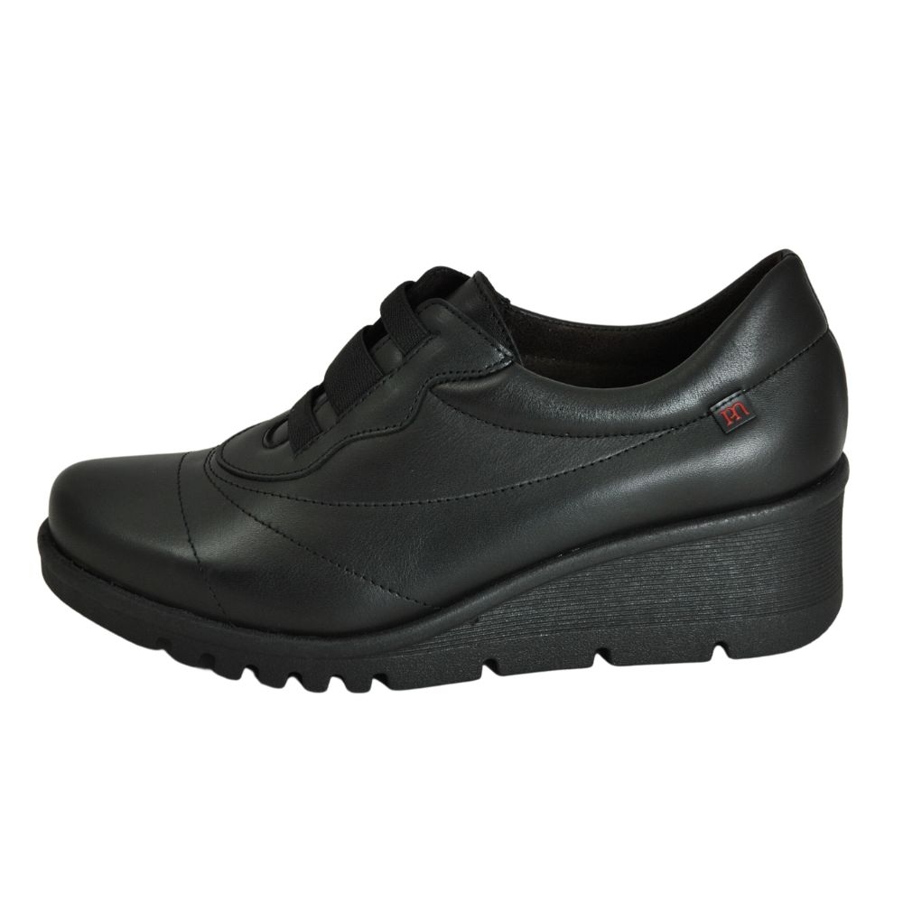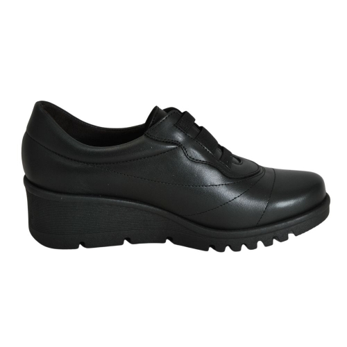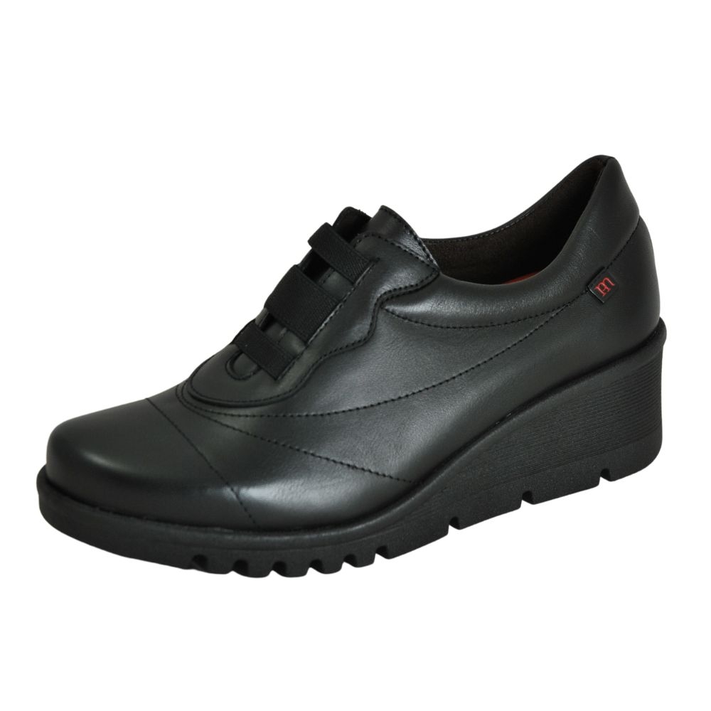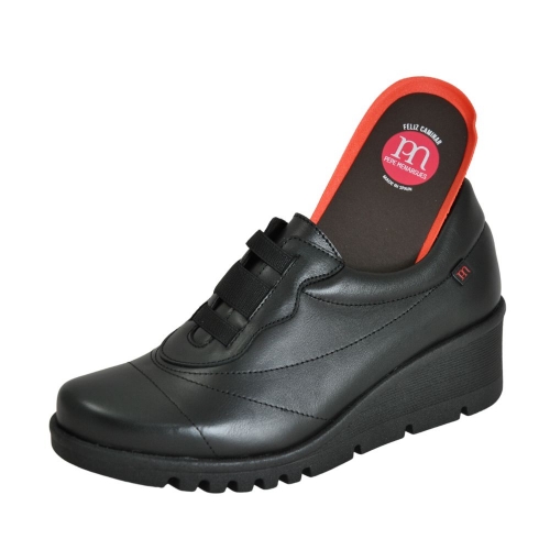 Zapato cómodo de mujer con cierre de elásticos modelo 20851. Fabricado en piel, con suela de goma. Plantilla acolchada y extraíble. Color Negro. Modelo ligero, transpirable, con plantilla extraíble, flexible, con absorción de impactos y suave. Hecho en España.