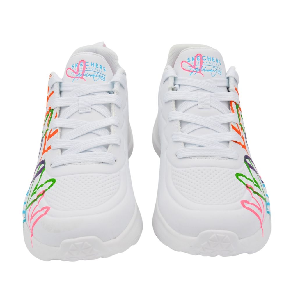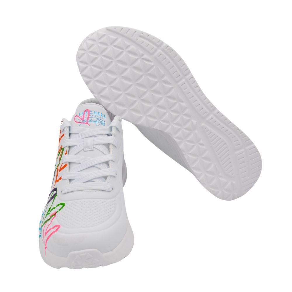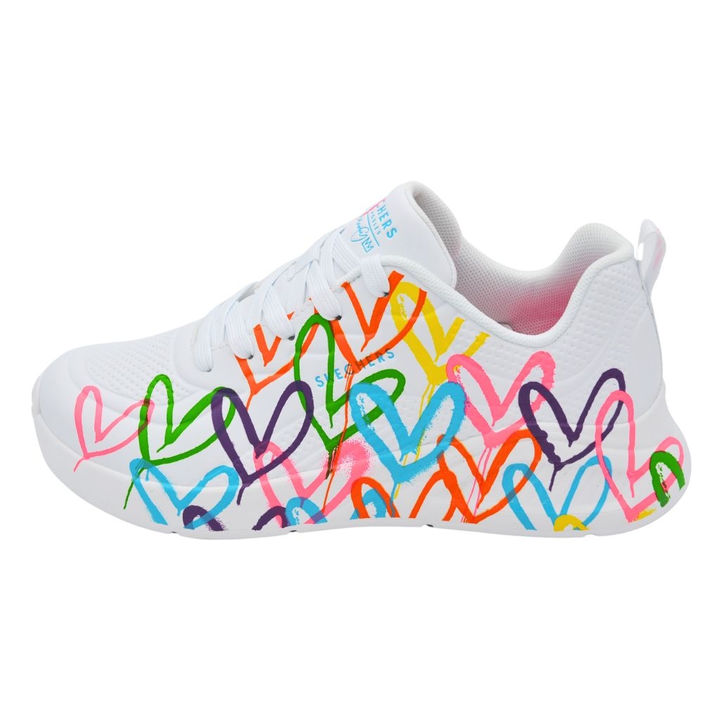 El muralista de renombre internacional James Goldcrown trae sus icónicos diseños de corazones #Lovewall a Skechers en esta inspiradora colaboración. Muestra tu estilo creativo con Skechers x JGoldcrown: Skechers Street™ Uno Lite - Heart of Hearts. Esta zapatilla de moda con cordones presenta un estampado del diseño de corazón característico del artista que se extiende hasta la suela exterior, durabuck sintético y parte superior perforada con una plantilla Skechers Air-Cooled Memory Foam®, además de una entresuela de cuña con plataforma.
